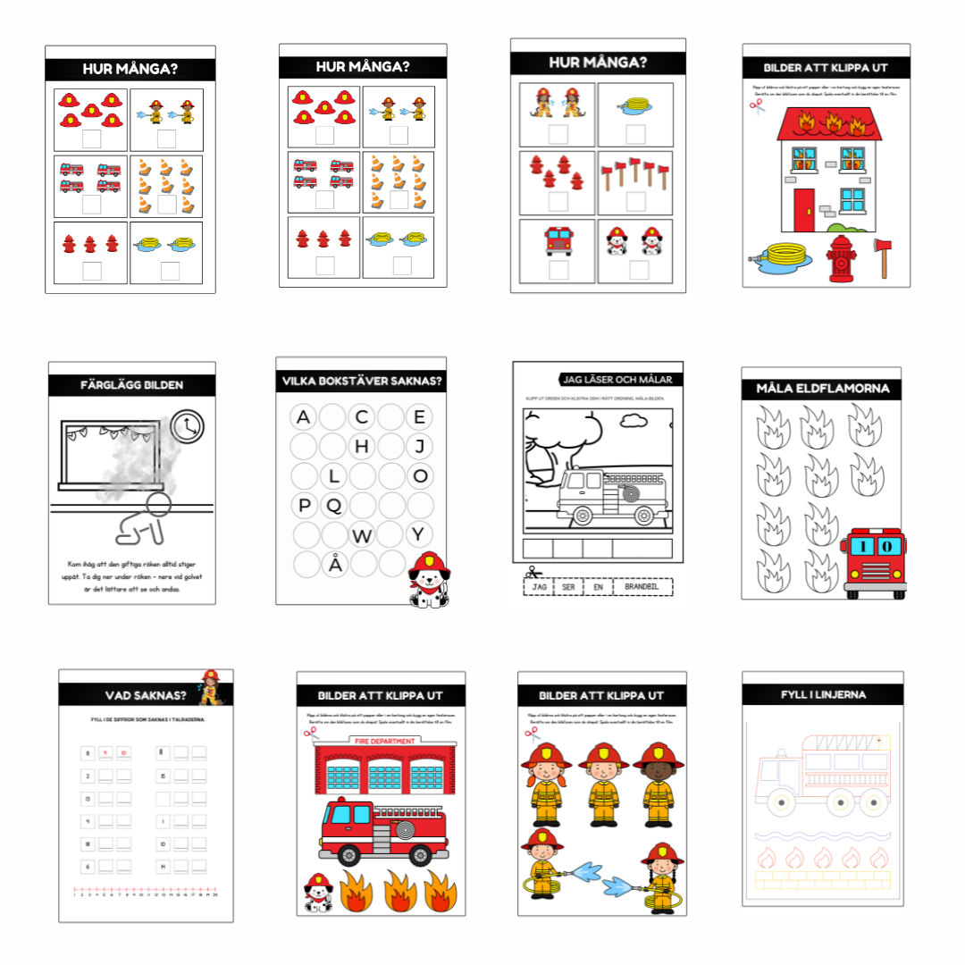 Här finns ett häfte på 24 sidor som lär ut hur man agerar vid en brand, målarbilder, träna på ord och begrepp kopplat till området och pyssel och knåp uppgifter.