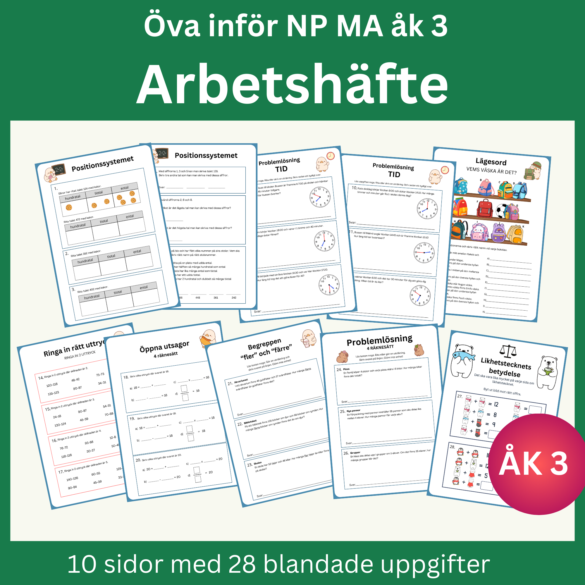 Arbetshäfte matematik åk 3, blandade uppgifter, 10 sidor