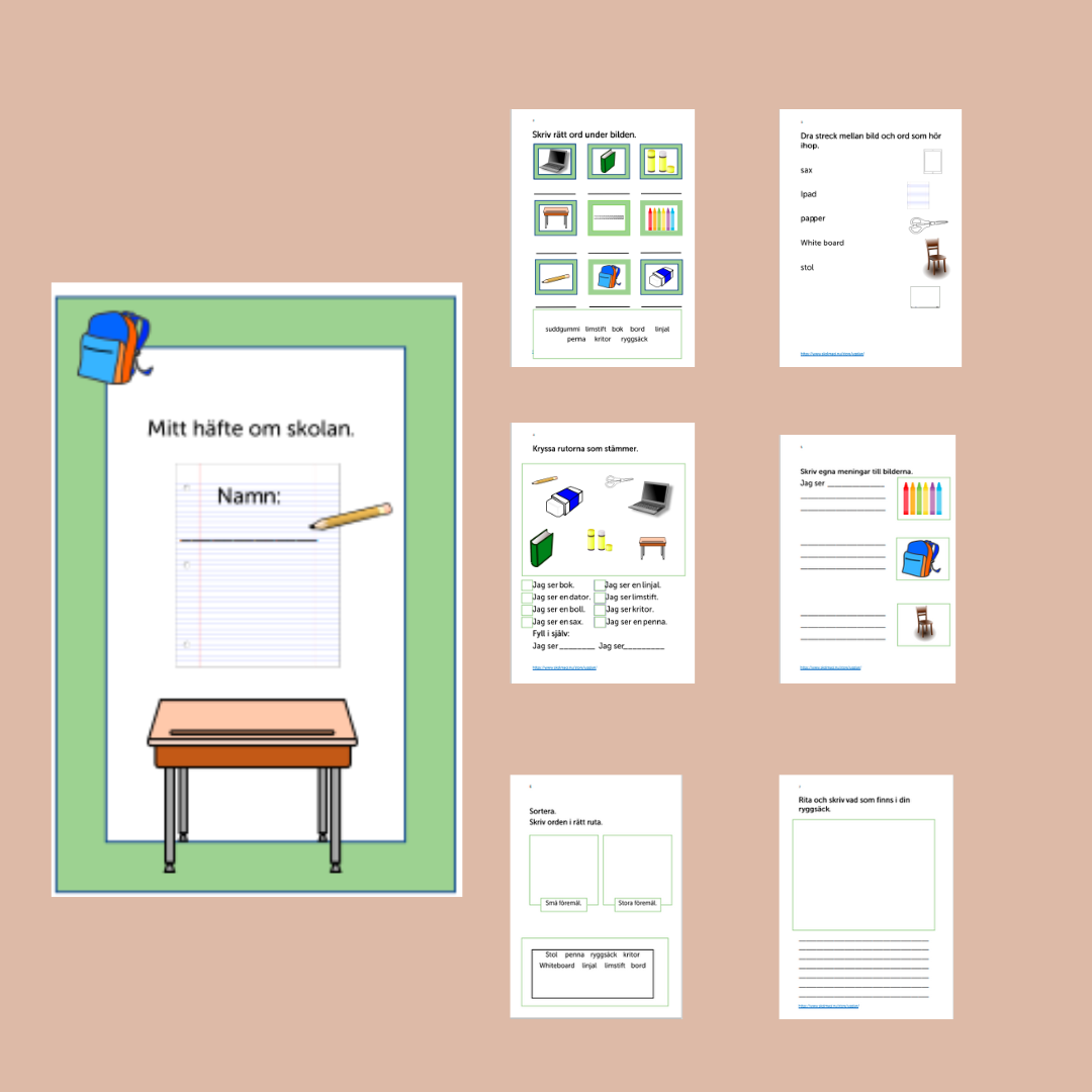 Arbetshäfte med sex arbetsblad där svårighetsgraden ökar.