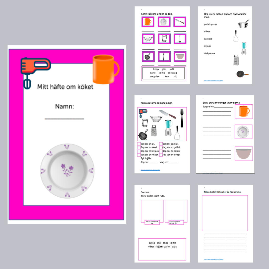 Arbetshäfte som tränar ordbilder: köket och köksredskap.