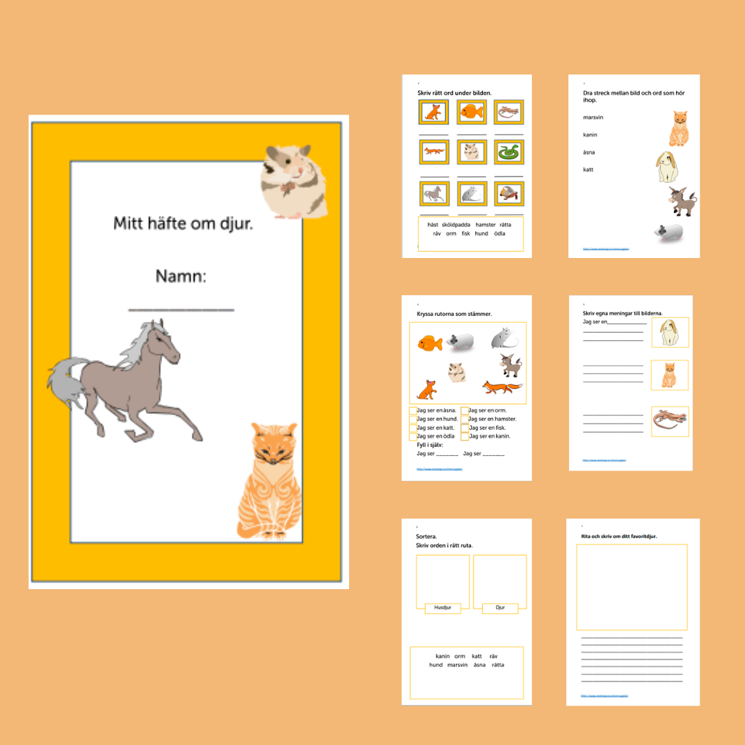 Arbetshäfte med sex arbetsblad där svårighetsgraden ökar.