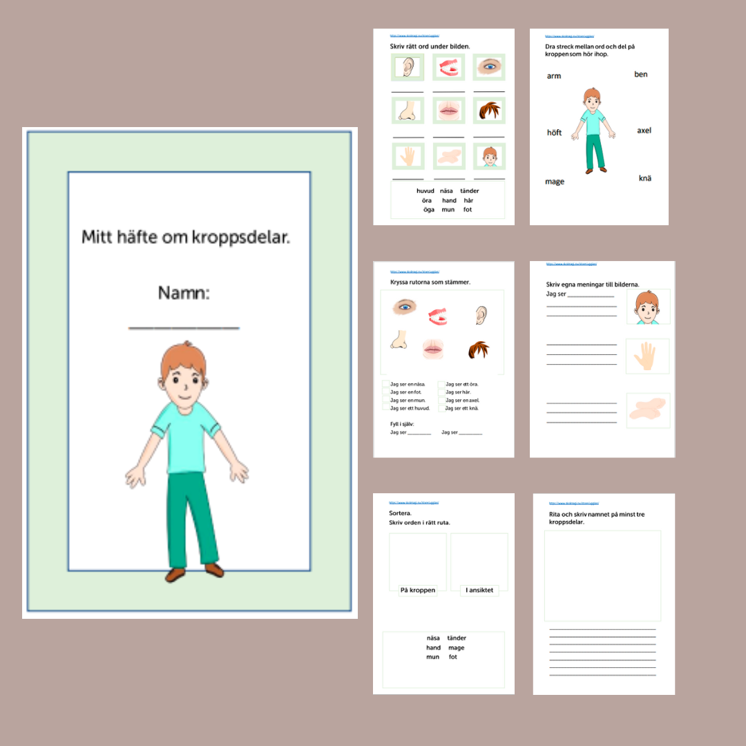 Arbetshäfte med sex arbetsblad där svårighetsgraden ökar.