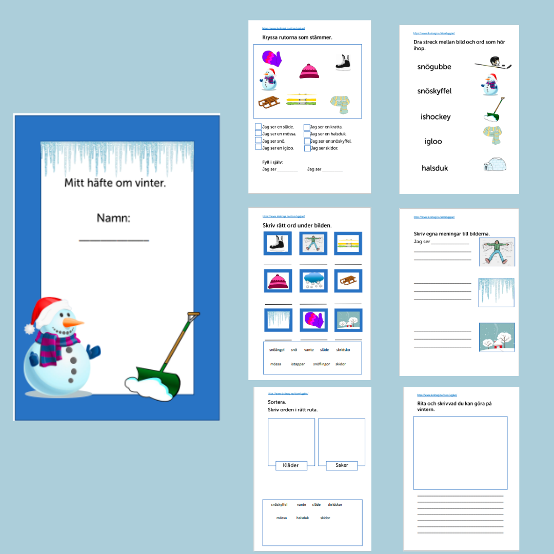 Arbetshäfte med sex arbetsblad där svårighetsgraden ökar.