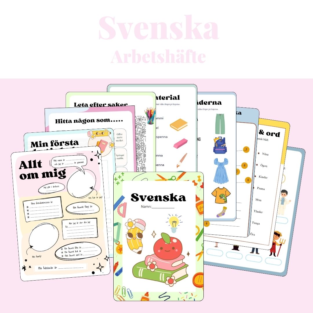 Denna pdf-innehåller ett arbetshäfte i svenska med 9 sidor av olika uppgifter. Det är allt ifrån att eleverna ska berätta om själva, om sin första skoldag, leta efter föremål, skriva vad de olika kroppsdelarna heter, matcha rätt yrke till rätt person och mycket mer.