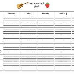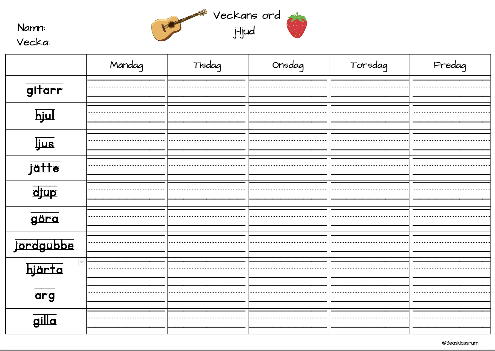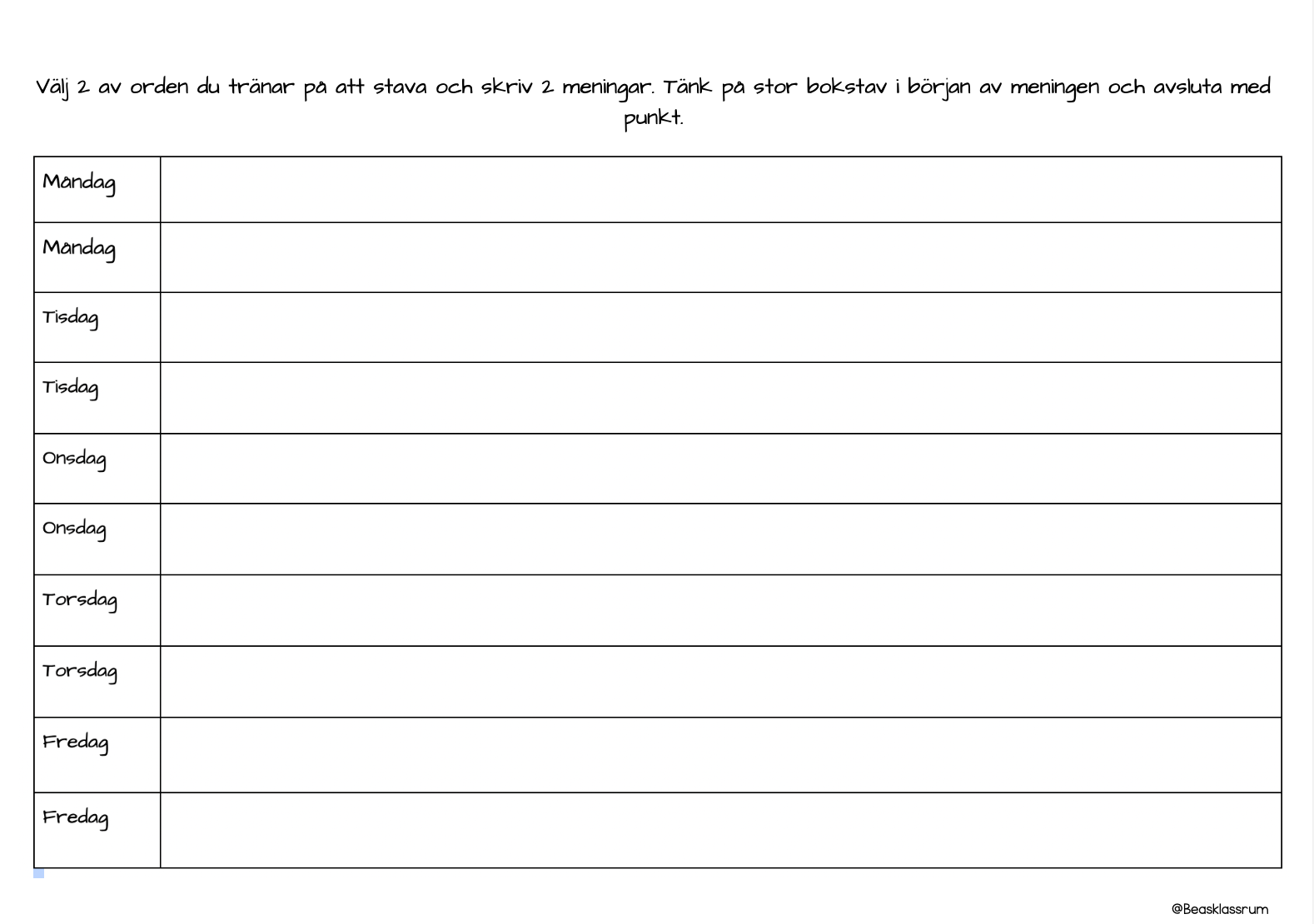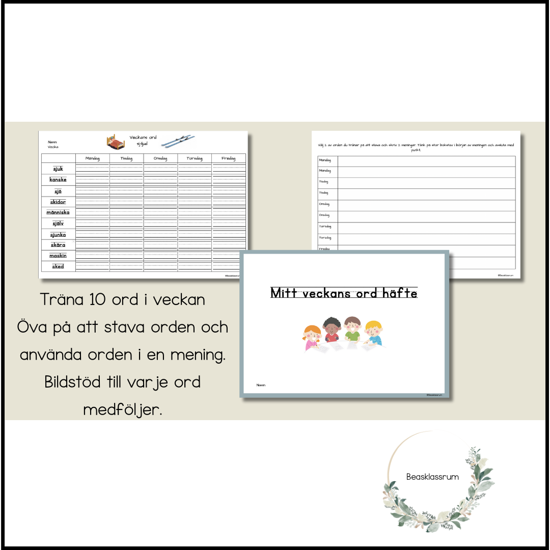 Häftet innehåller en sida med 10 ord som eleverna ska skriva en gång varje dag måndag-fredag. Innehåller också en sida där eleverna ska använda två av orden och skriva meningar.