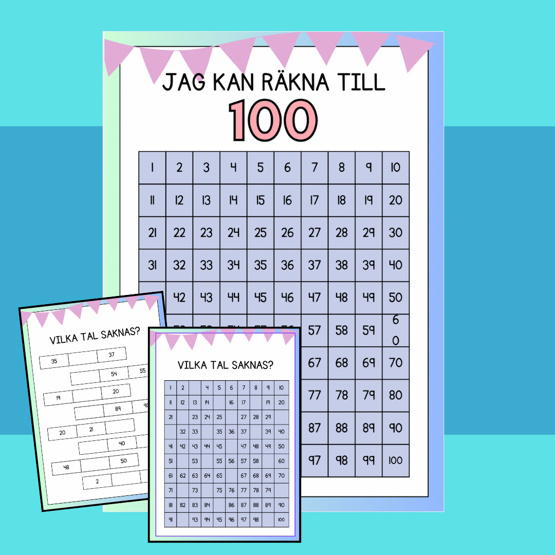 Detta material för att träna talen 0-100 består av fyra sidor och är utformat för att hjälpa eleverna att utveckla sina kunskaper om tal.