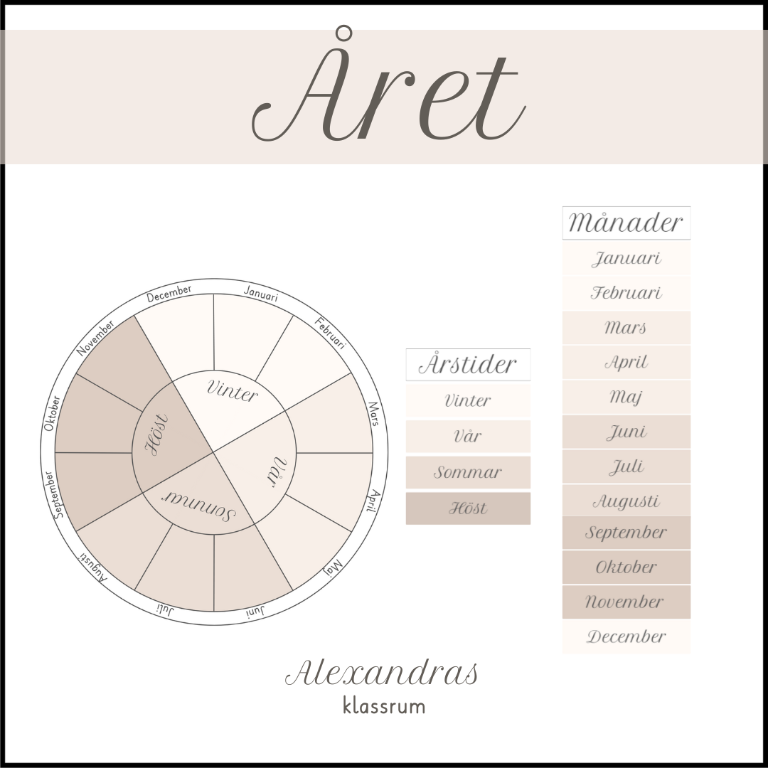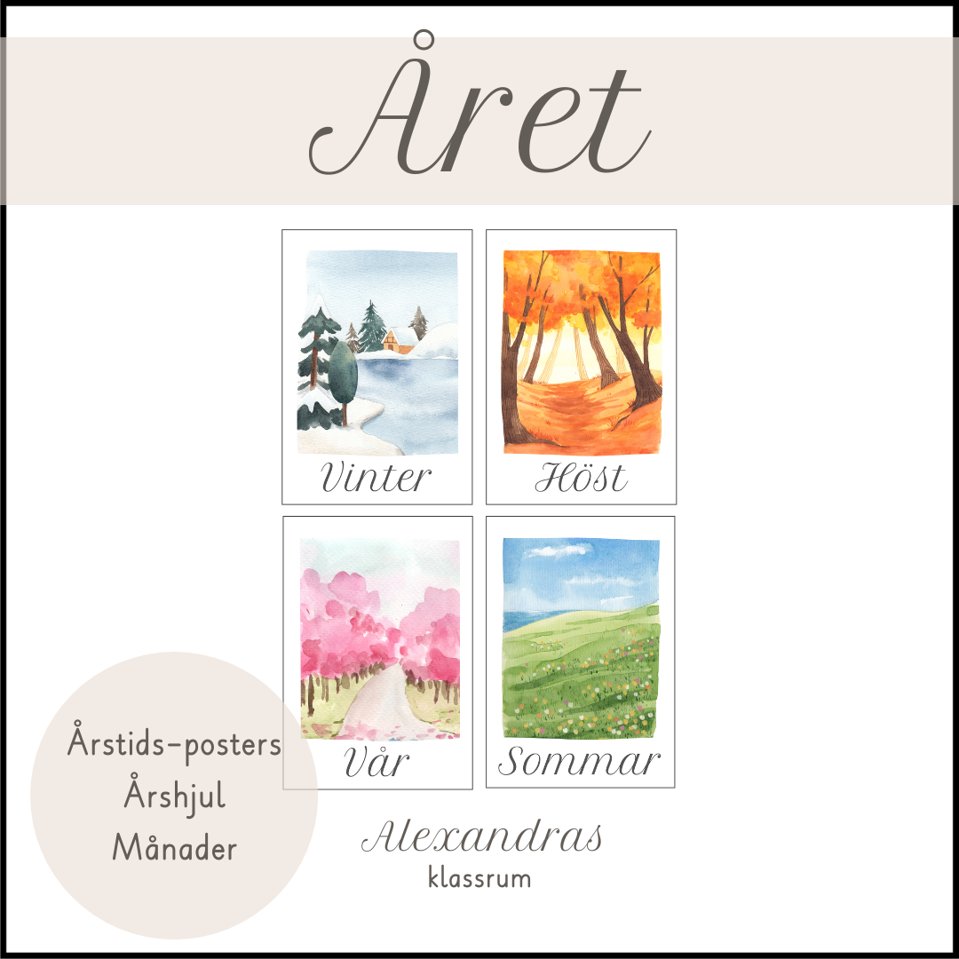 Året – inklusive årshjul, årstider, månader och dekorativa posters på årstiderna.