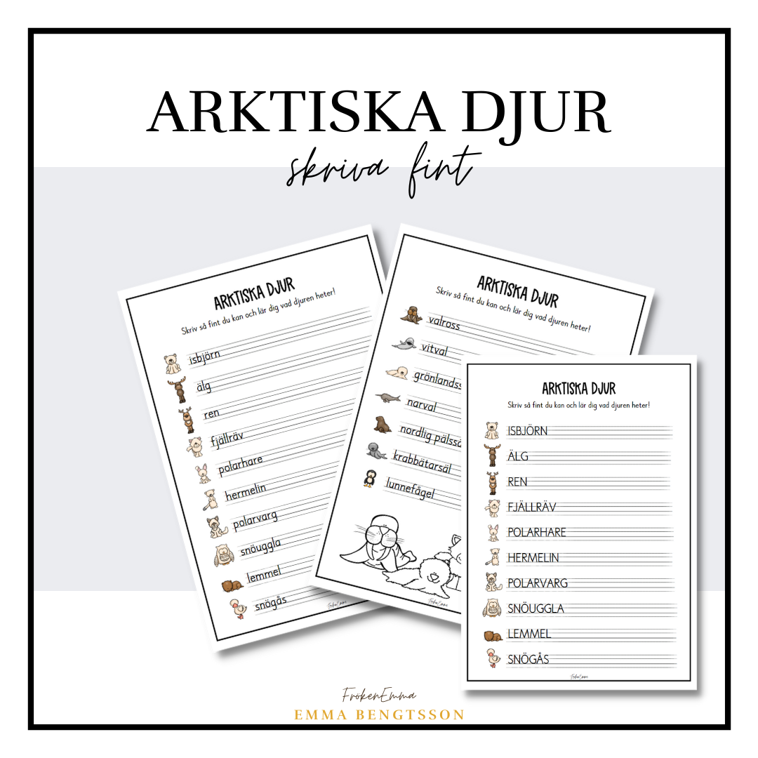 Genom dessa arbetsblad tränar eleven på att skriva med sin finaste handstil samtidigt som eleven även får befästa de arktiska djurens namn. Arbetsbladen finns med både versaler och gemener.