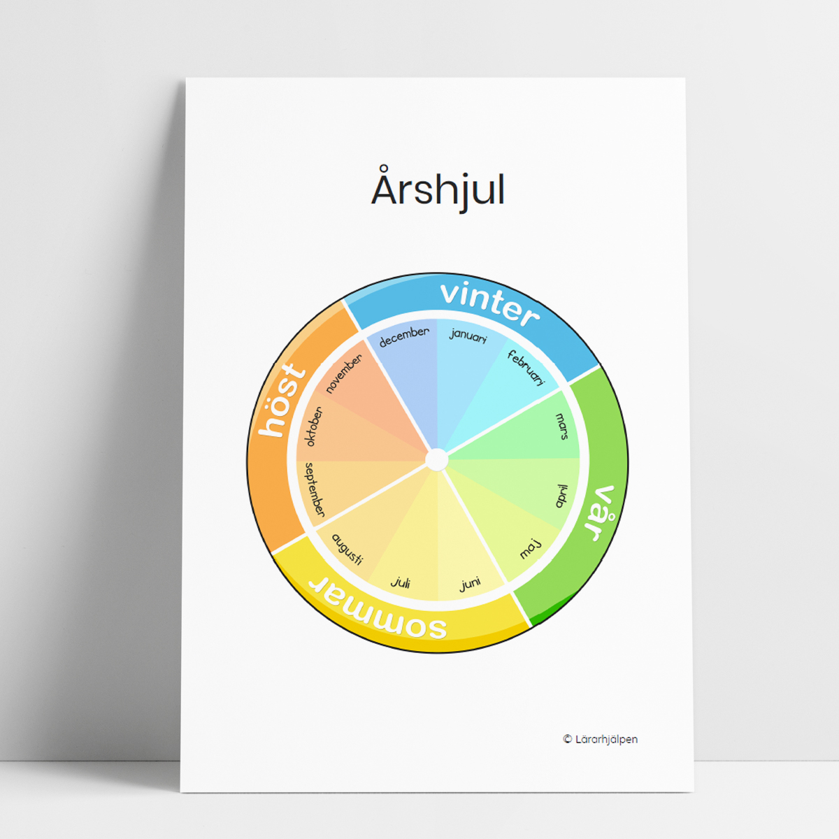Ett årshjul som går att använda i undervisningen eller ha uppsatt i klassrummet som affisch. Du kan till exempel använda årshjulet vid arbete om året, månader, kvartal, födelsedagar och månader som tillhör olika årstider. Inkluderar både en version i A4- och en i A3-format.