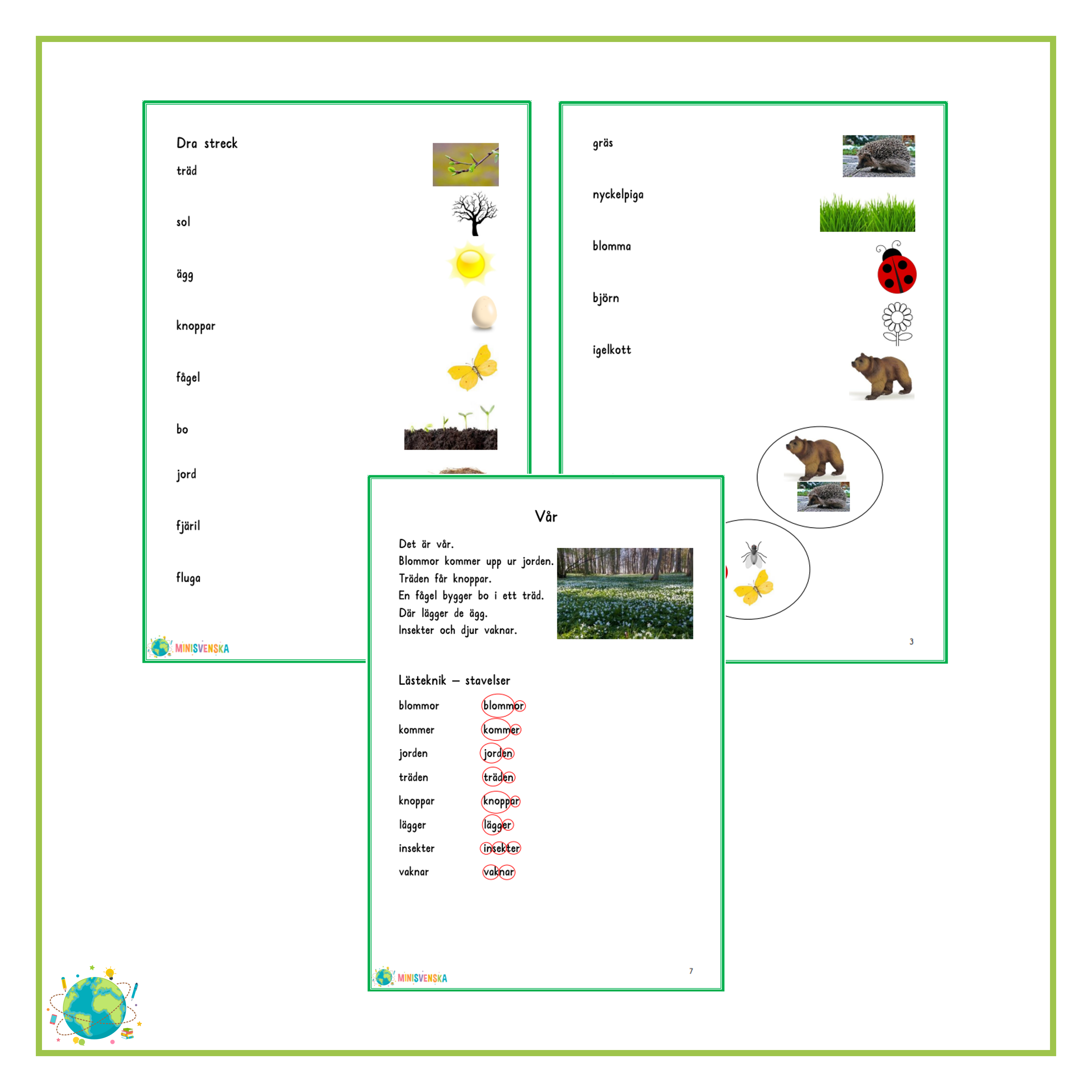 Årstiderna med blandade uppgifter i svenska och matematik.
