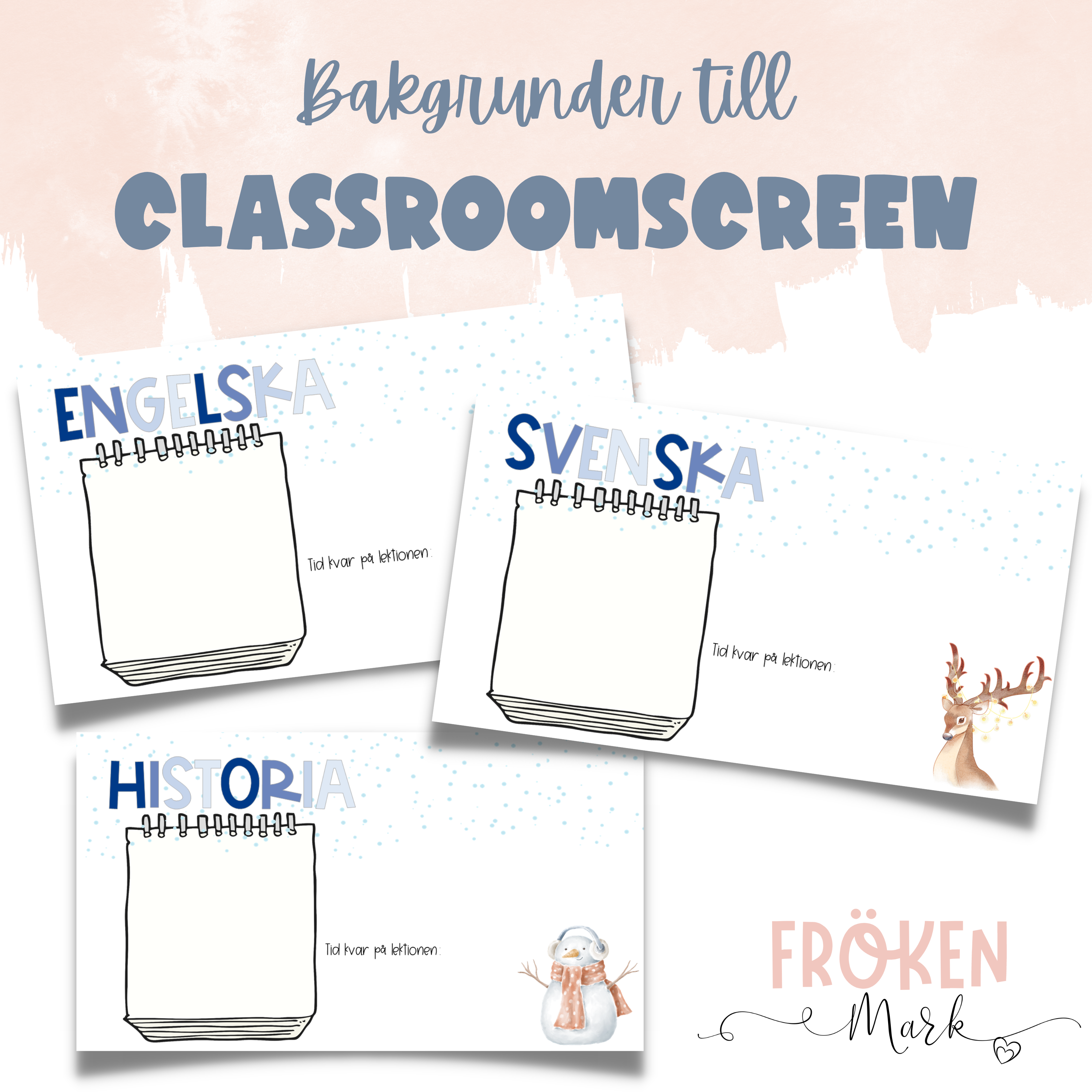 Bakgrunder till Classroomscreen i vintertema! Ladda upp på Classroomscreen.com som bakgrund och lägg till text, analog klocka och timer på hur lång tid det är kvar på lektionen för att tydliggöra lektionsstrukturen för eleverna. Bild två är ett exempel på hur det kan se ut. Följande ämnen är med i paketet: svenska, engelska, matematik, SO, samhällskunskap, religion, geografi, historia, NO, kemi, fysik, biologi och teknik. Format: PNG.