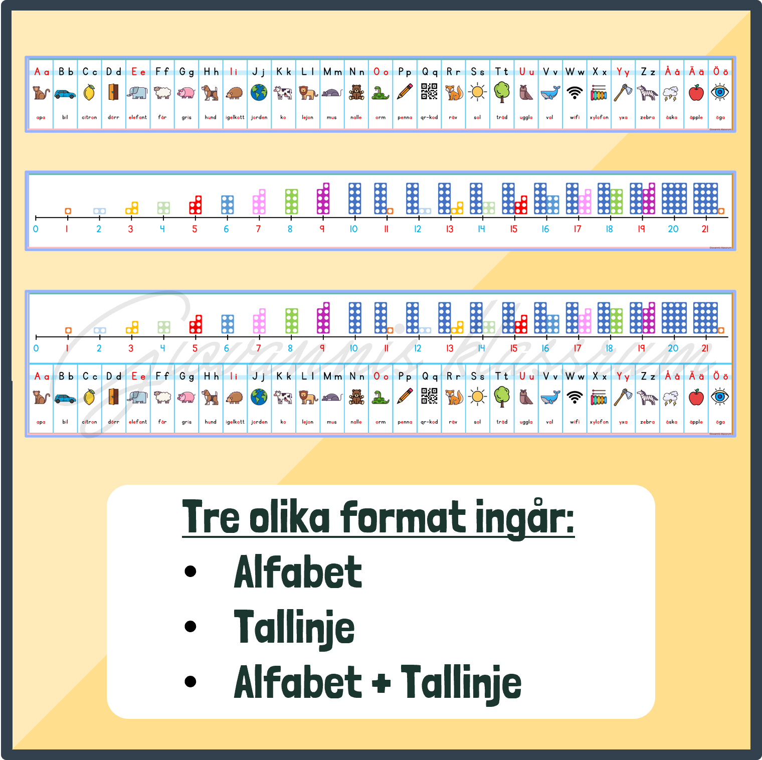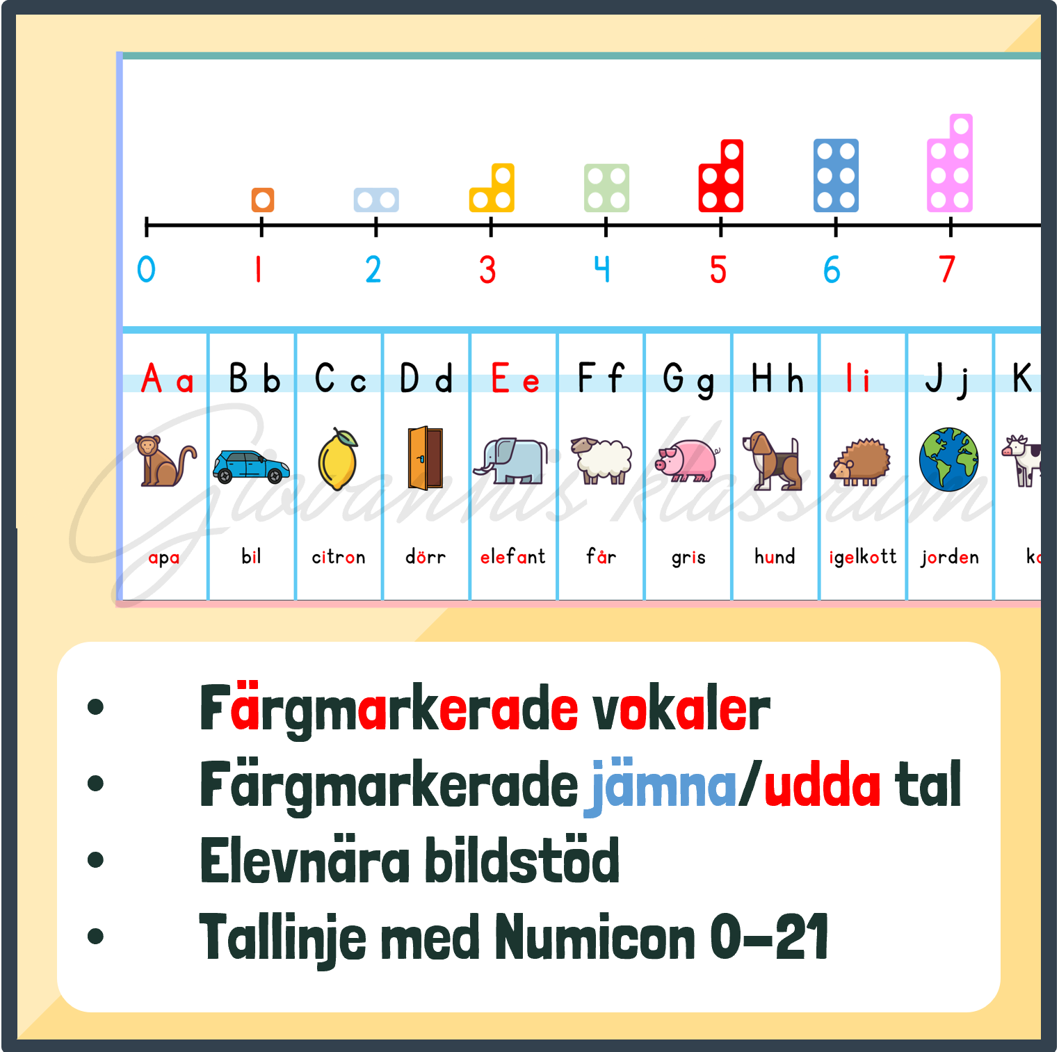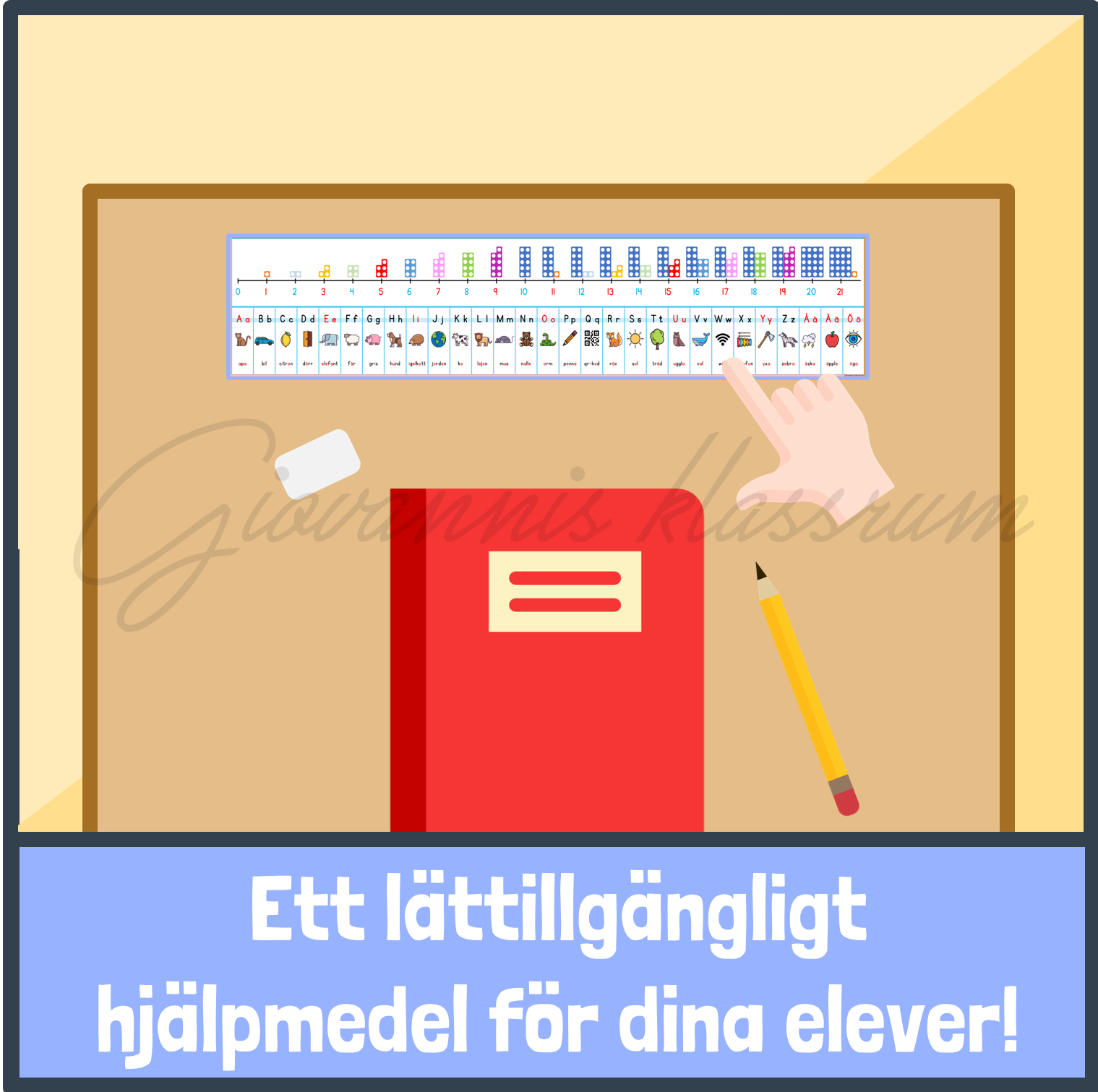 Här kommer ett tydligt alfabet och tallinje som dina elever kan ha på sina bänkar! Materialet är skapat för att vara så elevnära som möjligt för för att hjälpa dina elever att lära sig bokstäver och siffror. Vokaler och konsonanter är markerade i olika färger för att hjälpa dina elever att hitta dessa på ett enklare sätt. Tallinjen innehåller bildstöd i form av Numicon samt udda och jämna siffror markerade i olika färger. Skriv ut i A3 och sätt fast dessa på bänken!