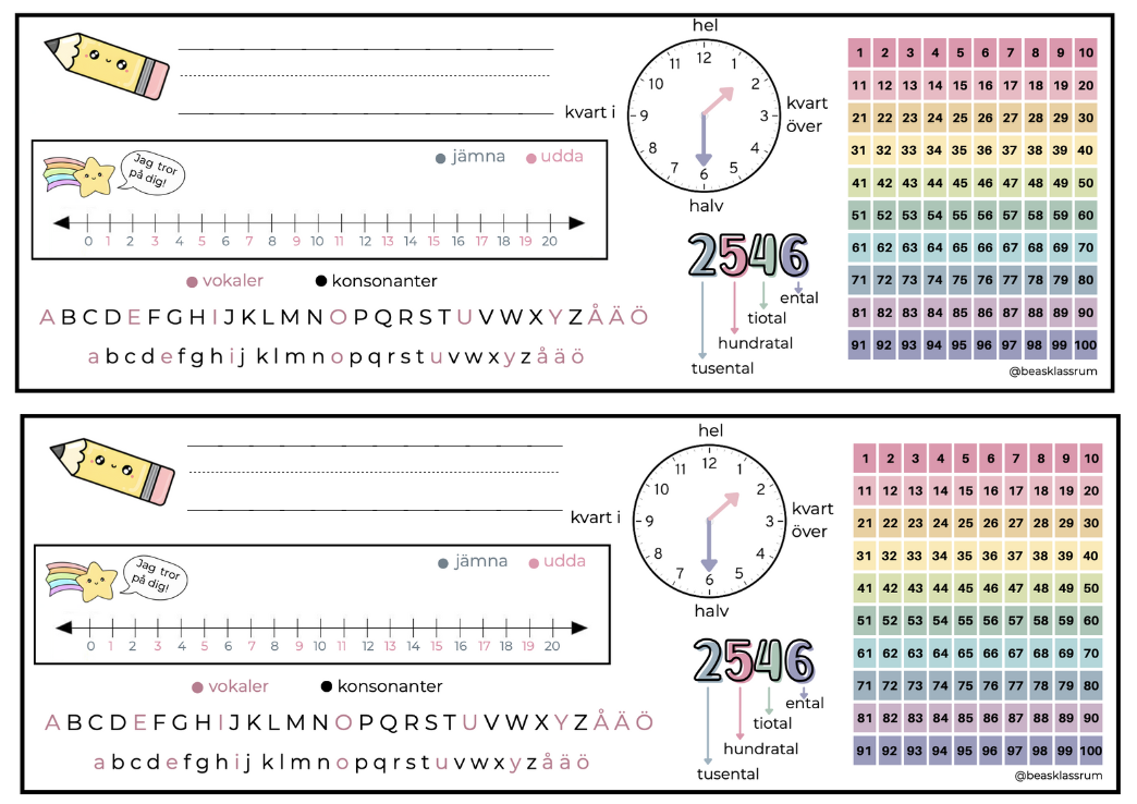 Bänkhjälp med alfabetet (vokaler och konsonanter markerade i olika färger), tallinje (udda och jämna tal markerade i olika färger), hundraruta, positionssystem och klockan.