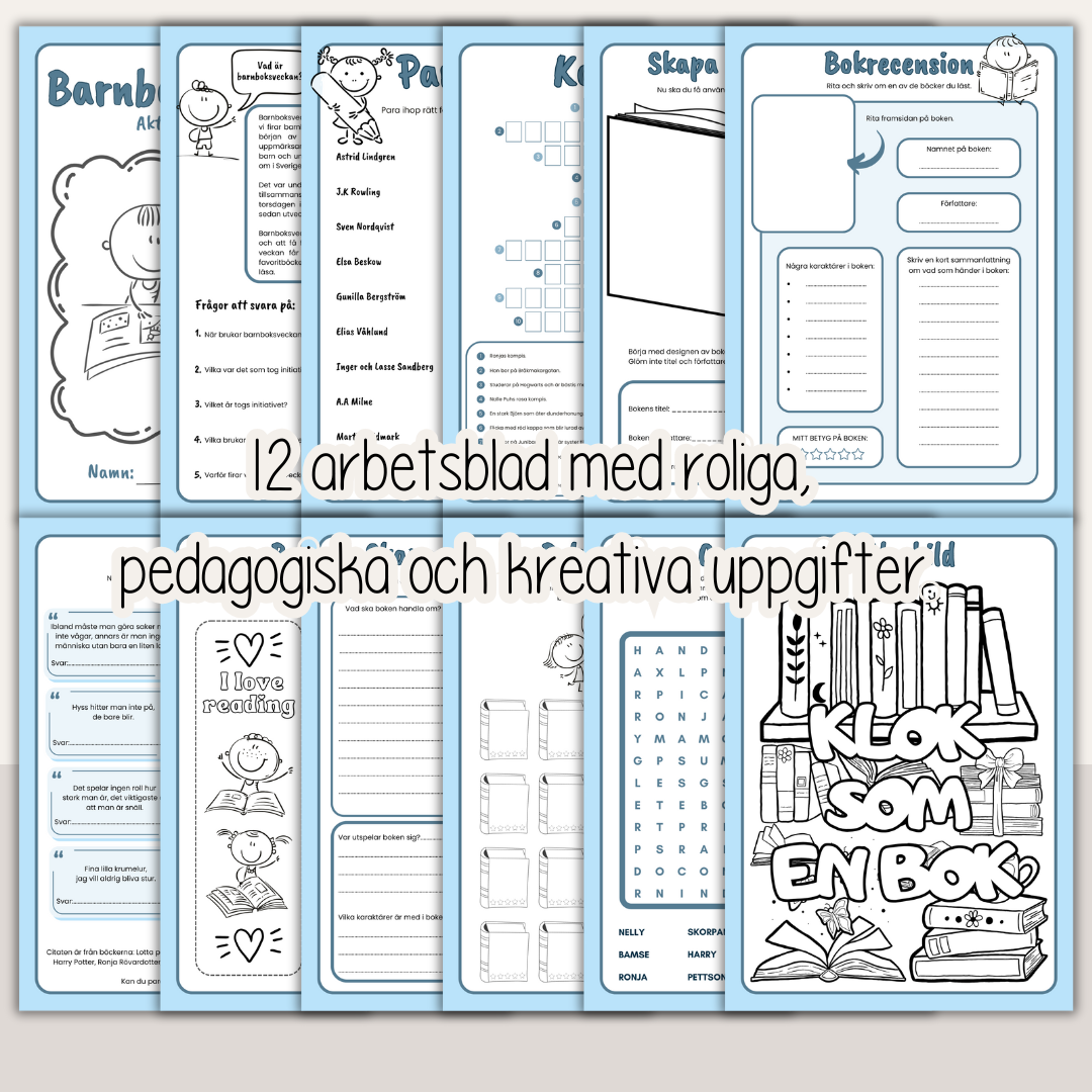 Ett arbetshäfte med olika uppgifter, fakta och klurigheter som har barnbokstema.