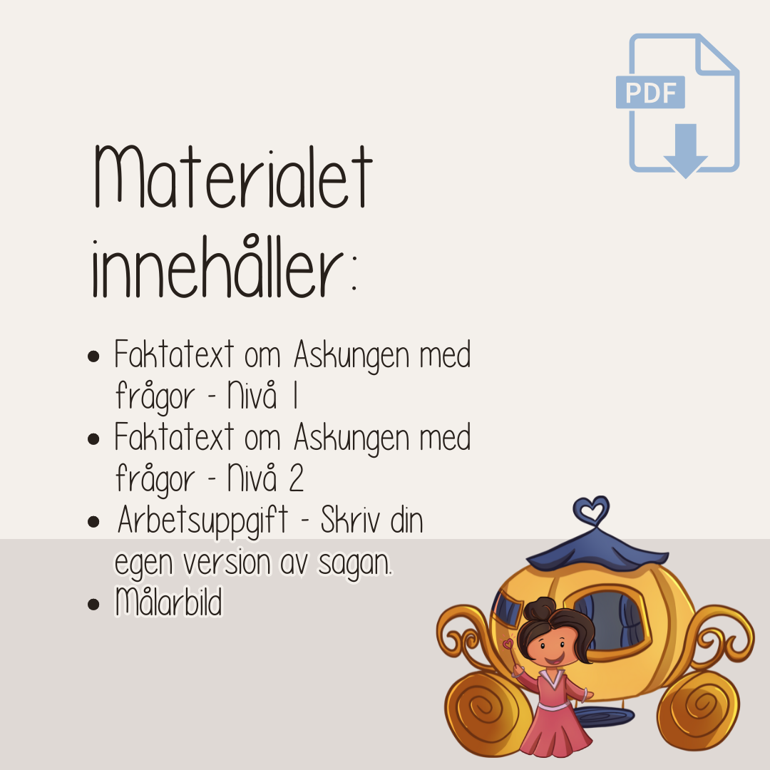 Material om sagan om Askungen. Faktatexten innehåller både fakta om historien runt berättelsen och innehållet i sagan.