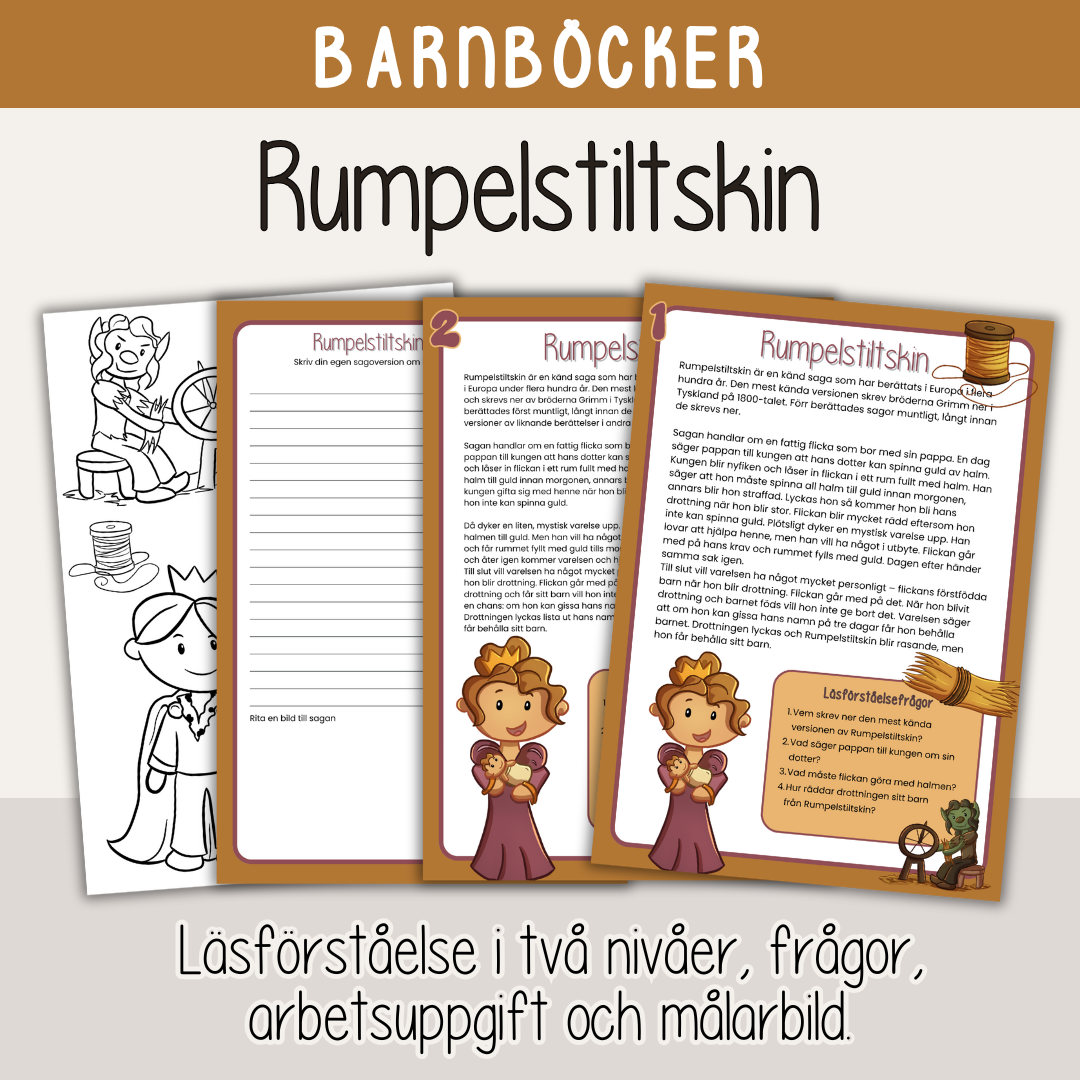 Material om sagan om Rumpelstiltskin. Faktatexten innehåller både fakta om historien runt berättelsen och innehållet i sagan.