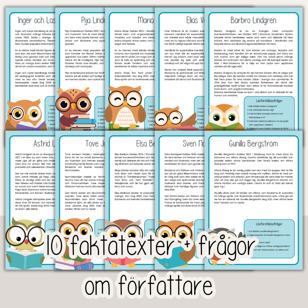 - 10 st faktatexter om barnboksförfattare med tillhörande läsförståelsefrågor.