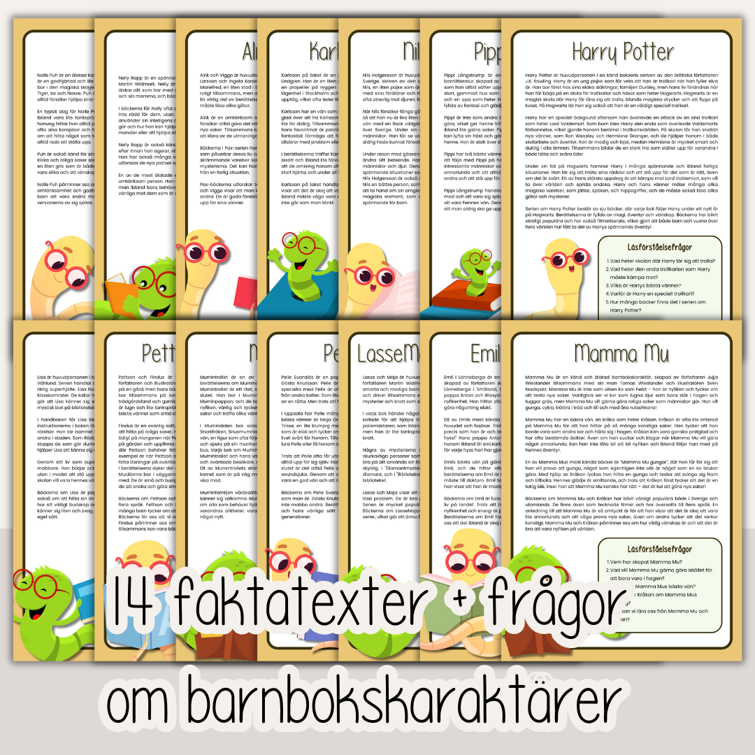- 14 st faktatexter om kända barnbokskaraktärer med tillhörande läsförståelsefrågor.