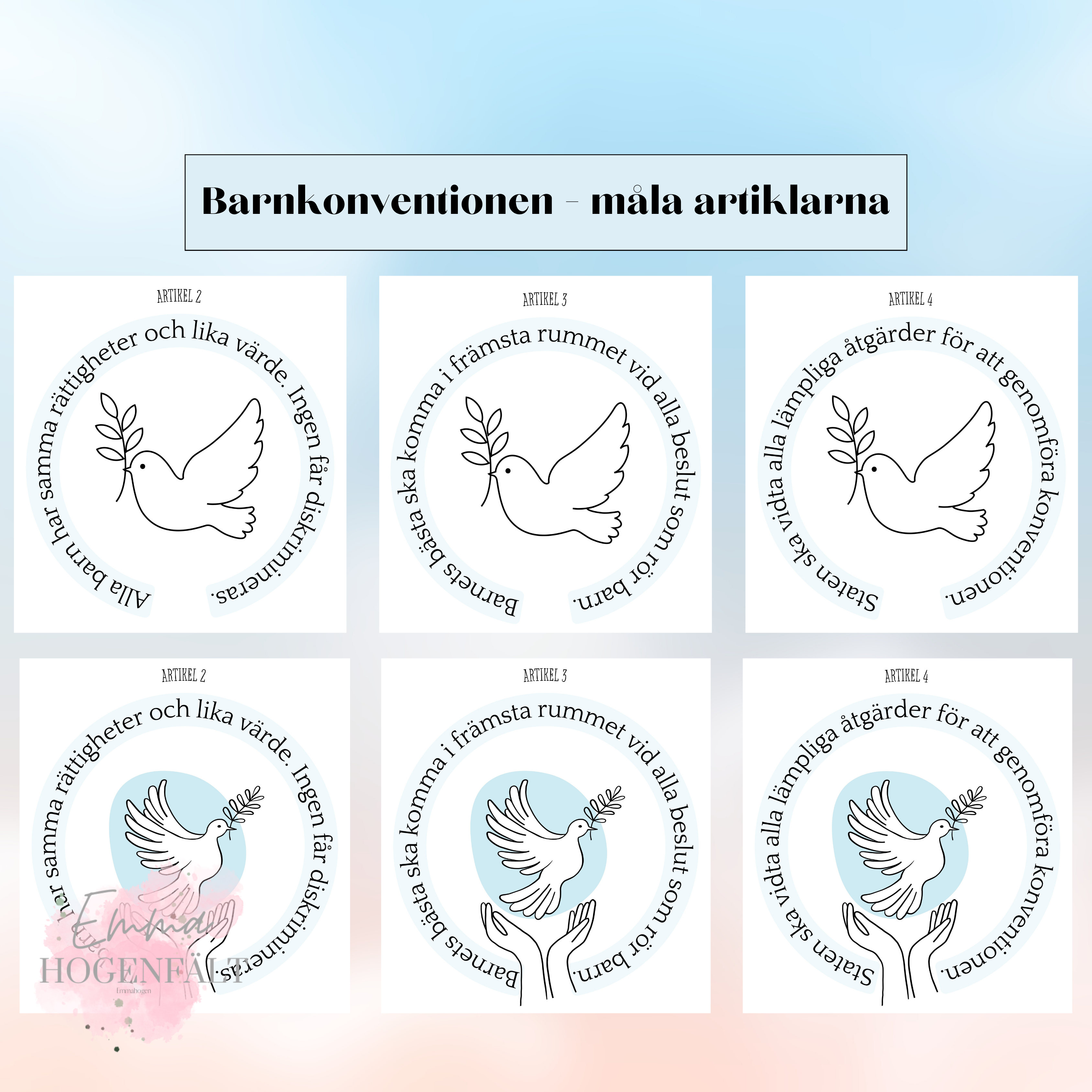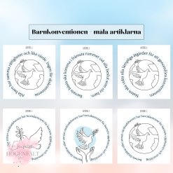 Ett material som innehåller alla barnkonventionens 46 artiklar. Det finns tre olika målarbilder till varje artikel, där artikelns innehåll står skriven runt bilden. Kommer i två storlekar (a4 +a6).