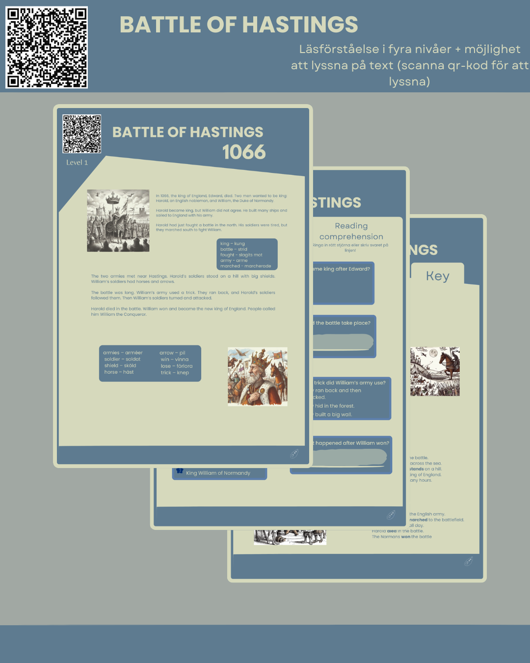 Läsförståelseuppgift om Battle of Hastings i fyra nivåer. Till texten finns läsförståelseuppgifter, och en liten grammatikdel (presens-preteritum för nivå 1-3 och regelbundna/oregelbundna verb för nivå 4). Facit kommer med till varje del.