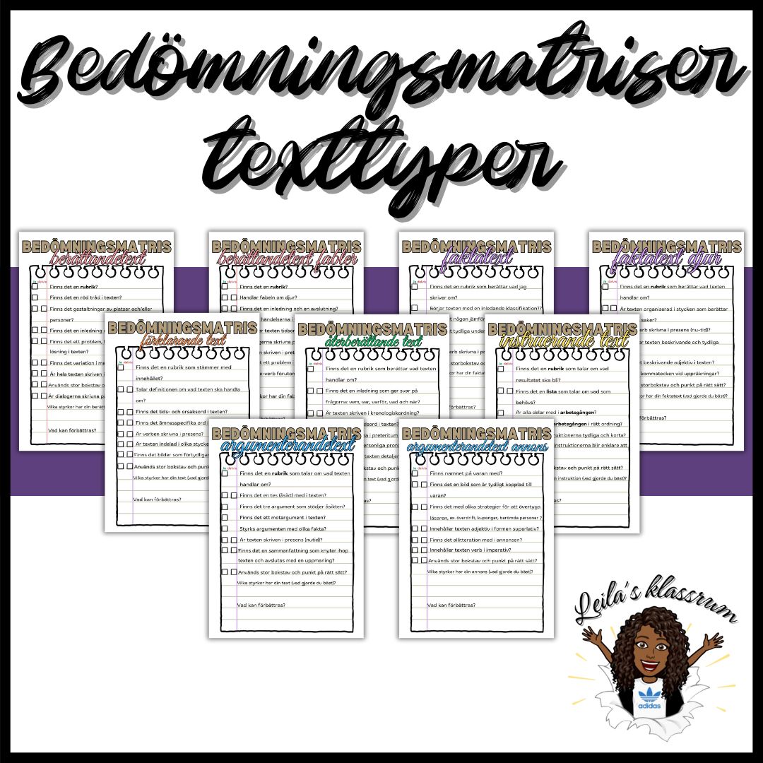 Bedömningsmatris till 9 olika texttyper. Eleven kan använda dem för själv bedömning, kamrat bedömning eller så kan du som lärare använda dem när du bedömer elevernas texter och ger skriftlig feedback.