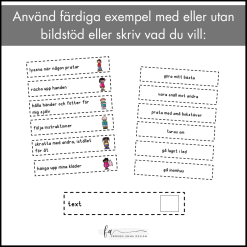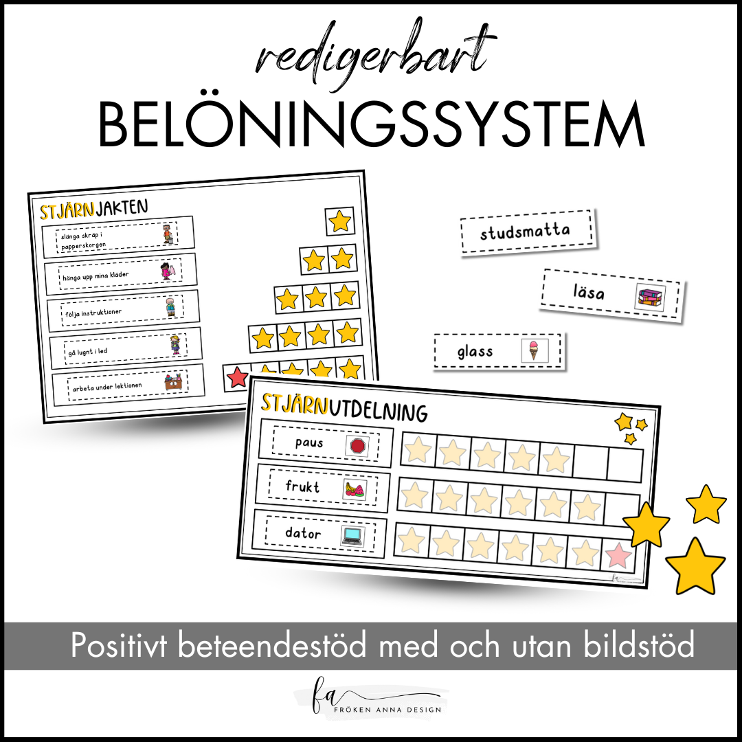 I detta material får du olika stjärnmallar med förslag på önskade beteenden / handlingar / förmågor samt en stjärnutdelning där barnet får välja på olika belöningar. Vill du inte använda de färdiga förslagen ingår en redigerbar mall där du själv kan fylla i vad du önskar att barnet utvecklar, ändra belöning eller välj själv antalet stjärnor.