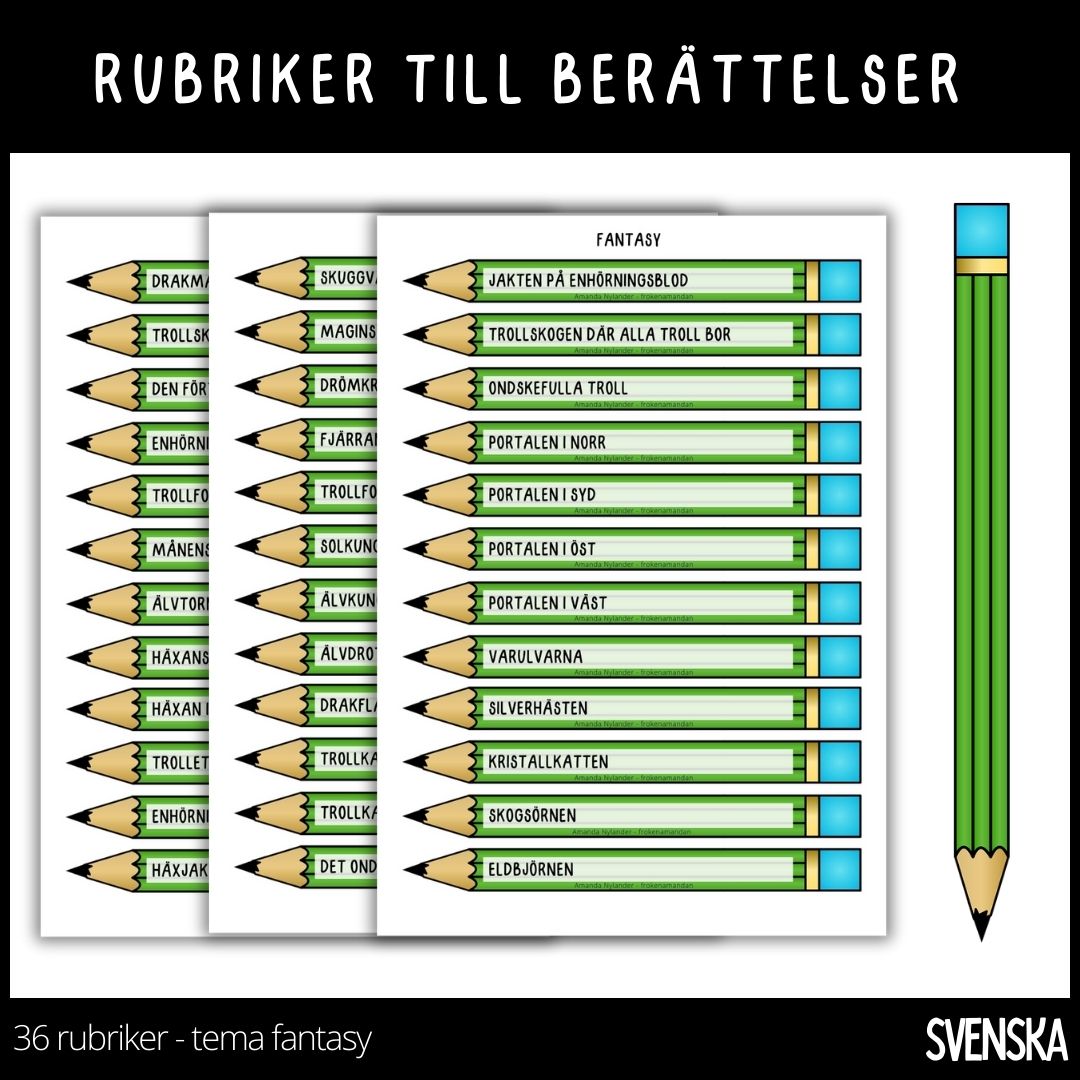 36 pennor med 36 olika rubriker på ämnade att användas vid lektionsmoment där eleverna övar på att skriva berättande texter med temat fantasy. Pennorna med rubriker är tänkta att fungera som stöd för de elever som har svårt att komma igång. Låt eleverna dra en gemensam penna eller var sin penna och låt dem sedan skriva till rubriken ensam, i par eller i mindre grupp.