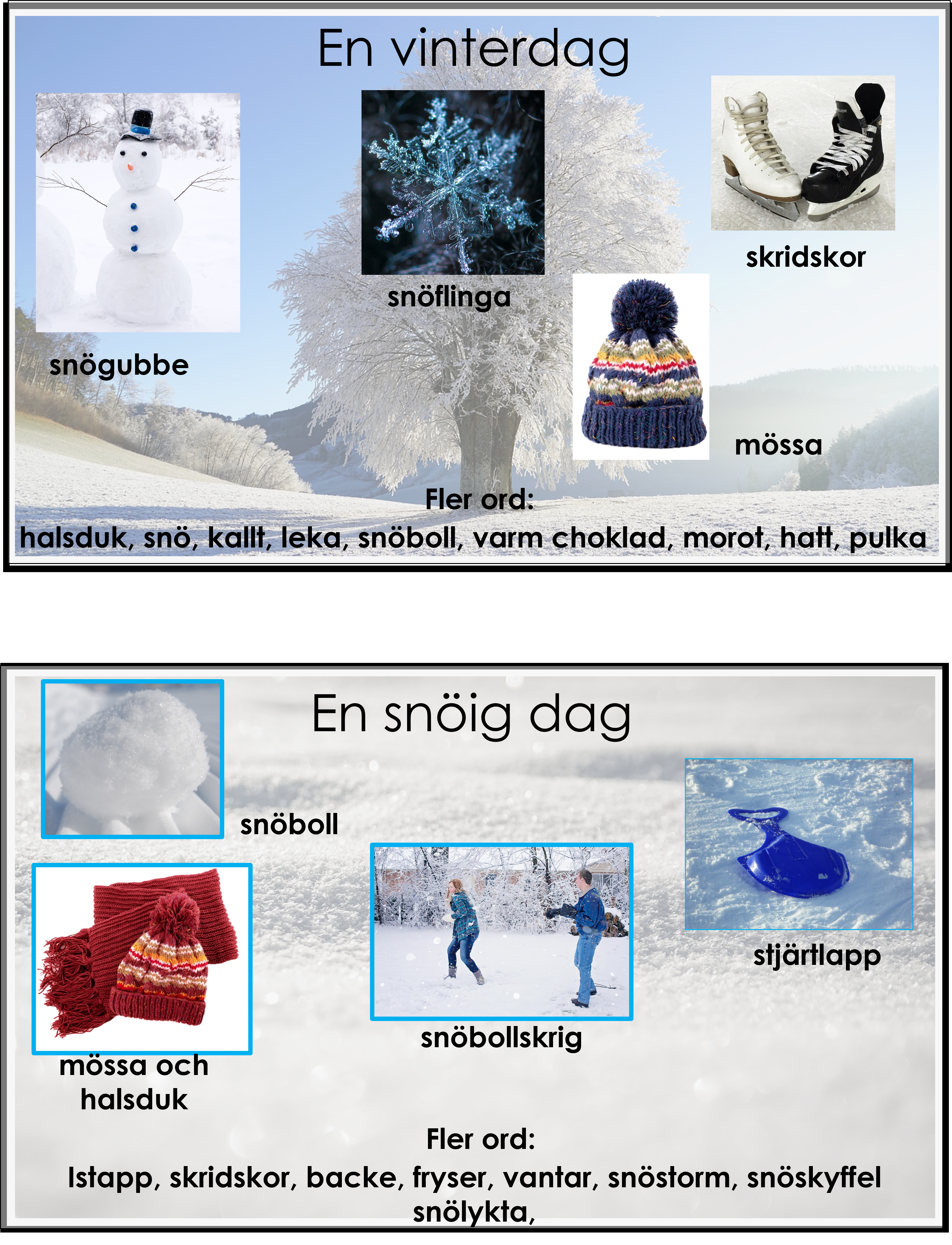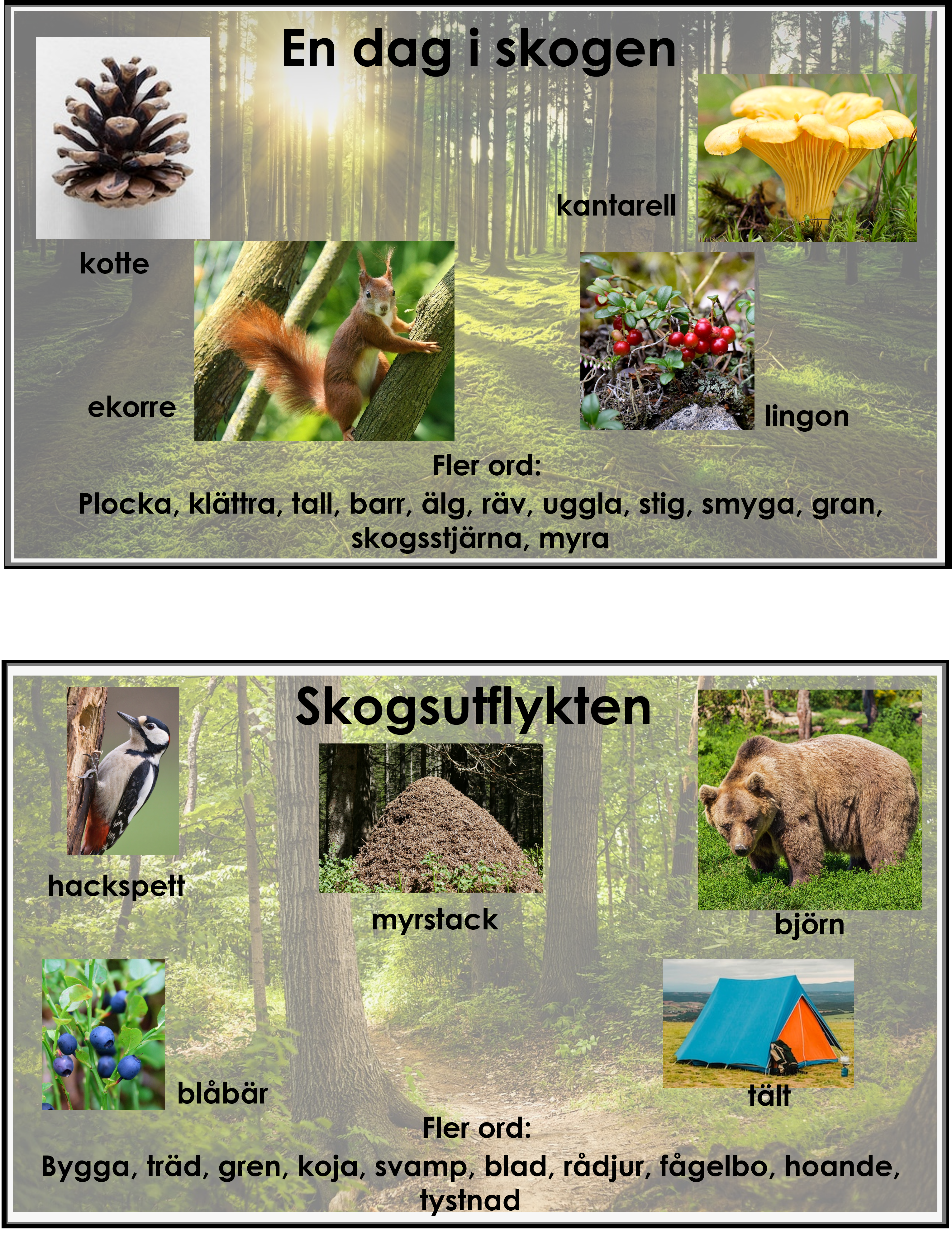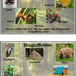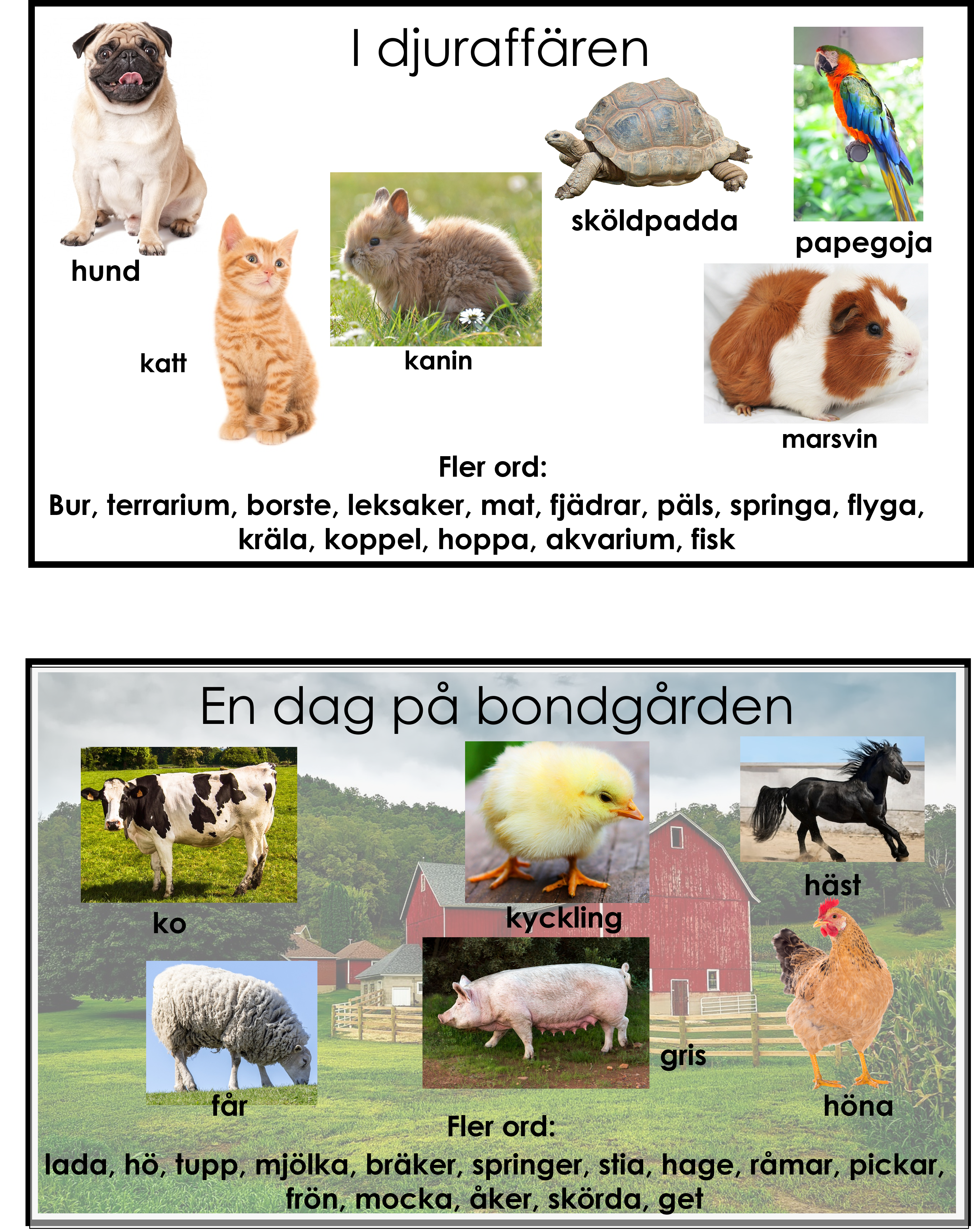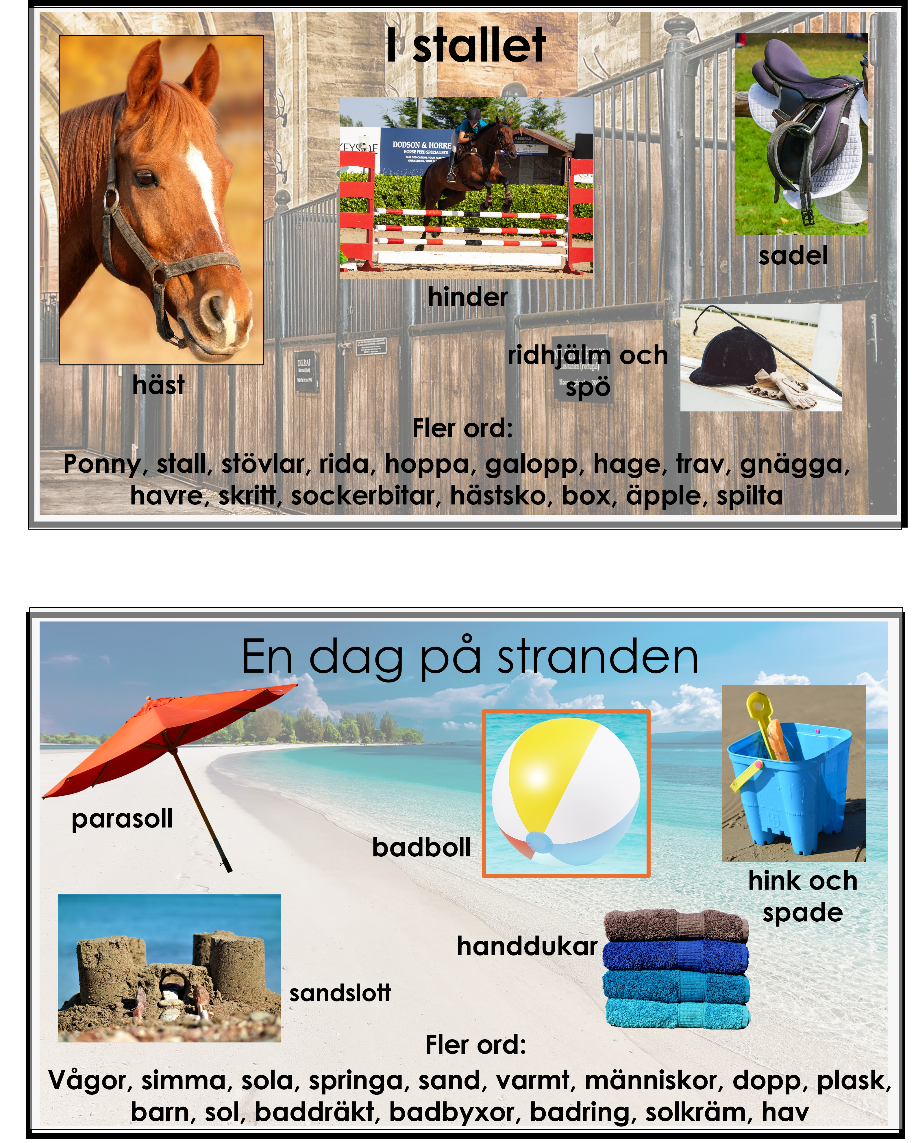 Materialet innehåller 8 berättelsekort (i stallet, en dag på stranden, en vinterdag, en snöig dag, en dag i skogen, skogsutflykten, i djuraffären och en dag på bondgården)