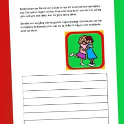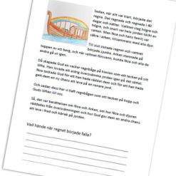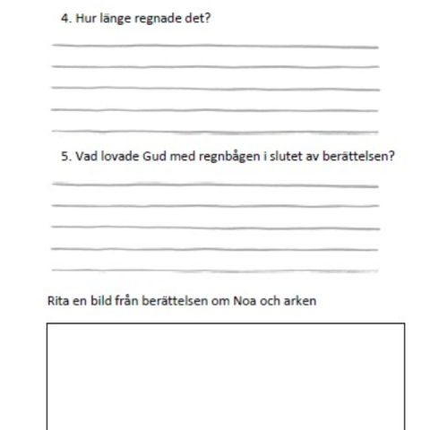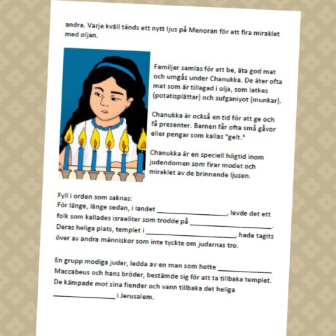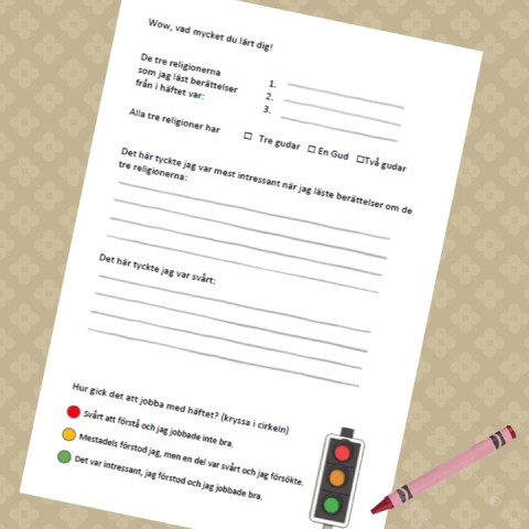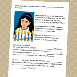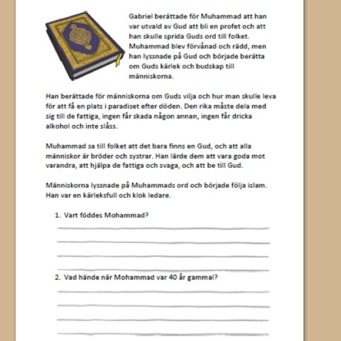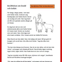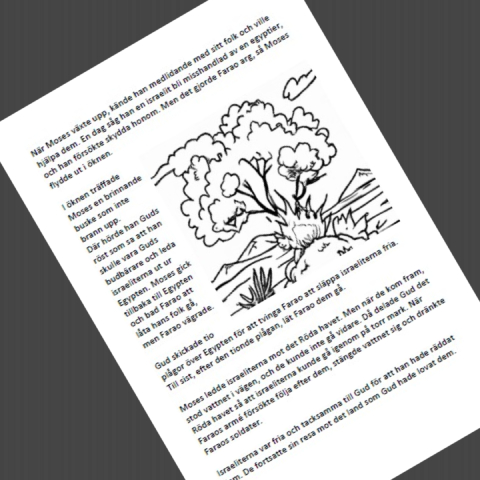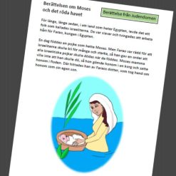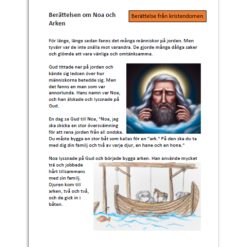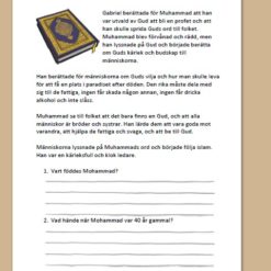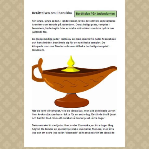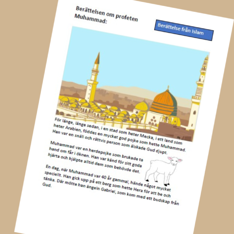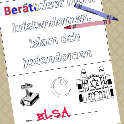 2 berättelser vardera inom kristendom, islam och judendom med tillhörande bilder illustrerade av mig, samt läsförståelse och bilder att färglägga.