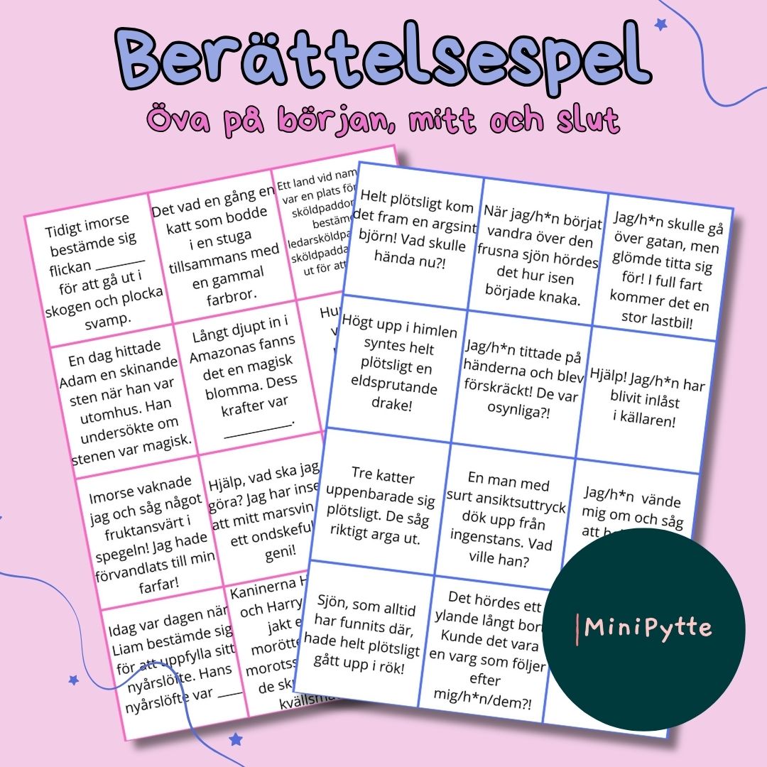 Ett roligt sätt att öva på att göra berättelser tillsammans med en klasskamrat! Dela in eleverna i par och låt paren ta ett rosa och ett blått kort. De rosa korten är ”börjor” och de blåa korten är ”mitten”-kort. Eleverna ska sedan skapa en gemensam berättelse utifrån dessa kort.