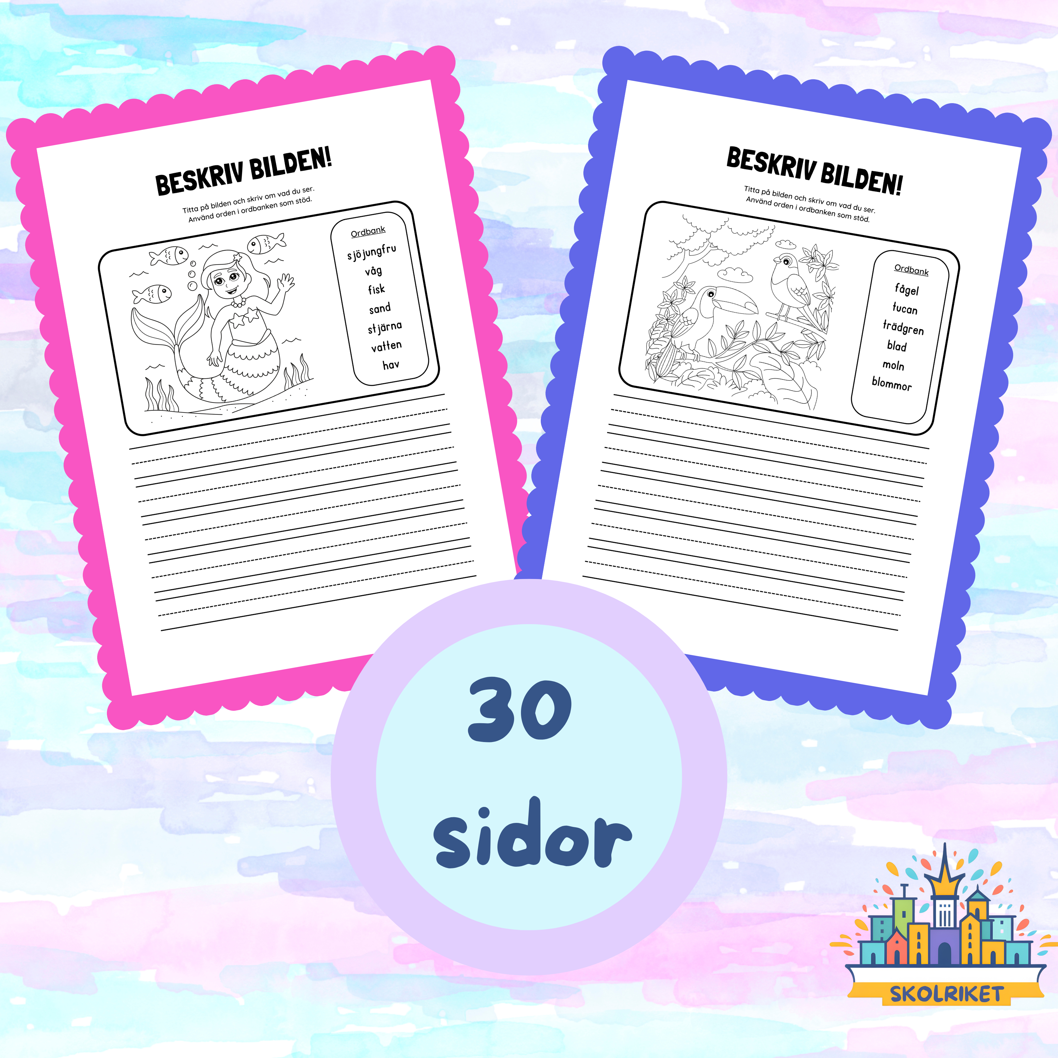 30 sidor av bilder att beskriva, finns stödord för varje bild att ta hjälp av.