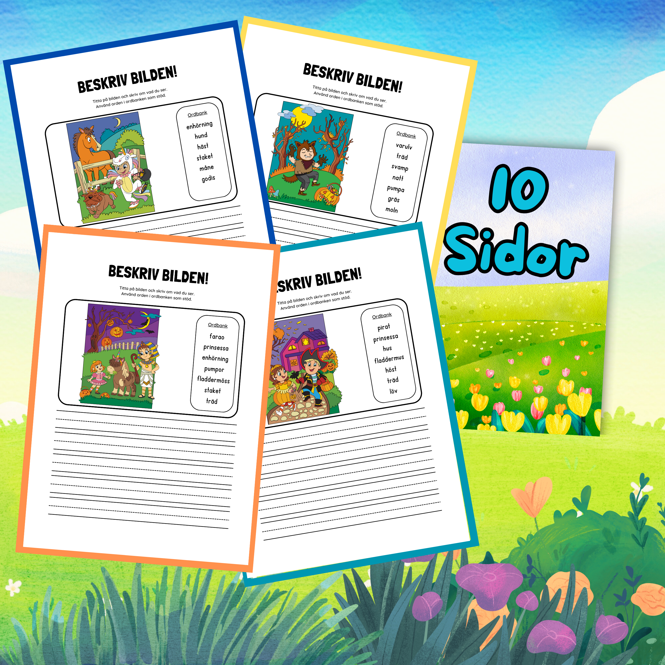 10 sidor av bilder med Halloween tema att beskriva, finns stödord för varje bild att ta hjälp av. OBS. Samma bilder som i Beskriv och Måla Bilden Halloween 2.