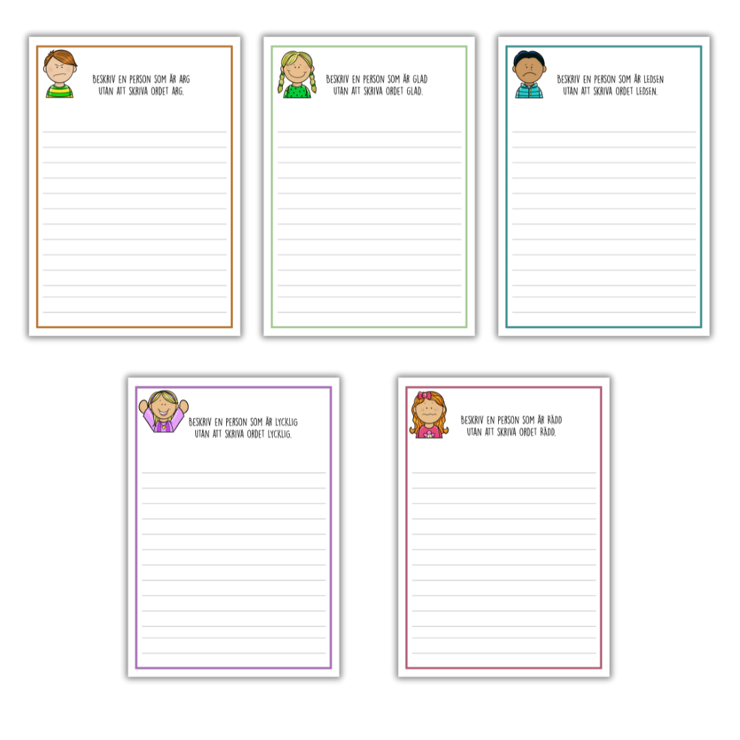 Beskriv känslan utan att skriva ordet. 5 stenciler. 5 olika känslor.