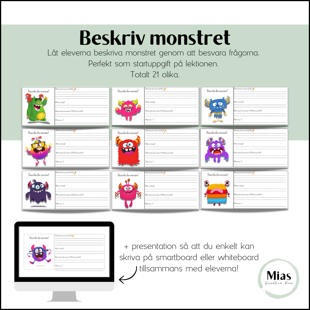 Till materialet kommer även en presentation att visa för klassen. Där kan du skriva elevernas förslag och ni kan tillsammans utveckla beskrivningarna på monstret.