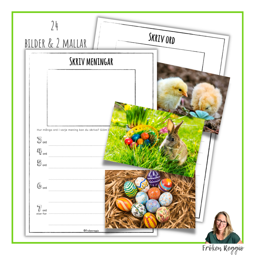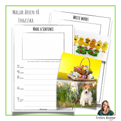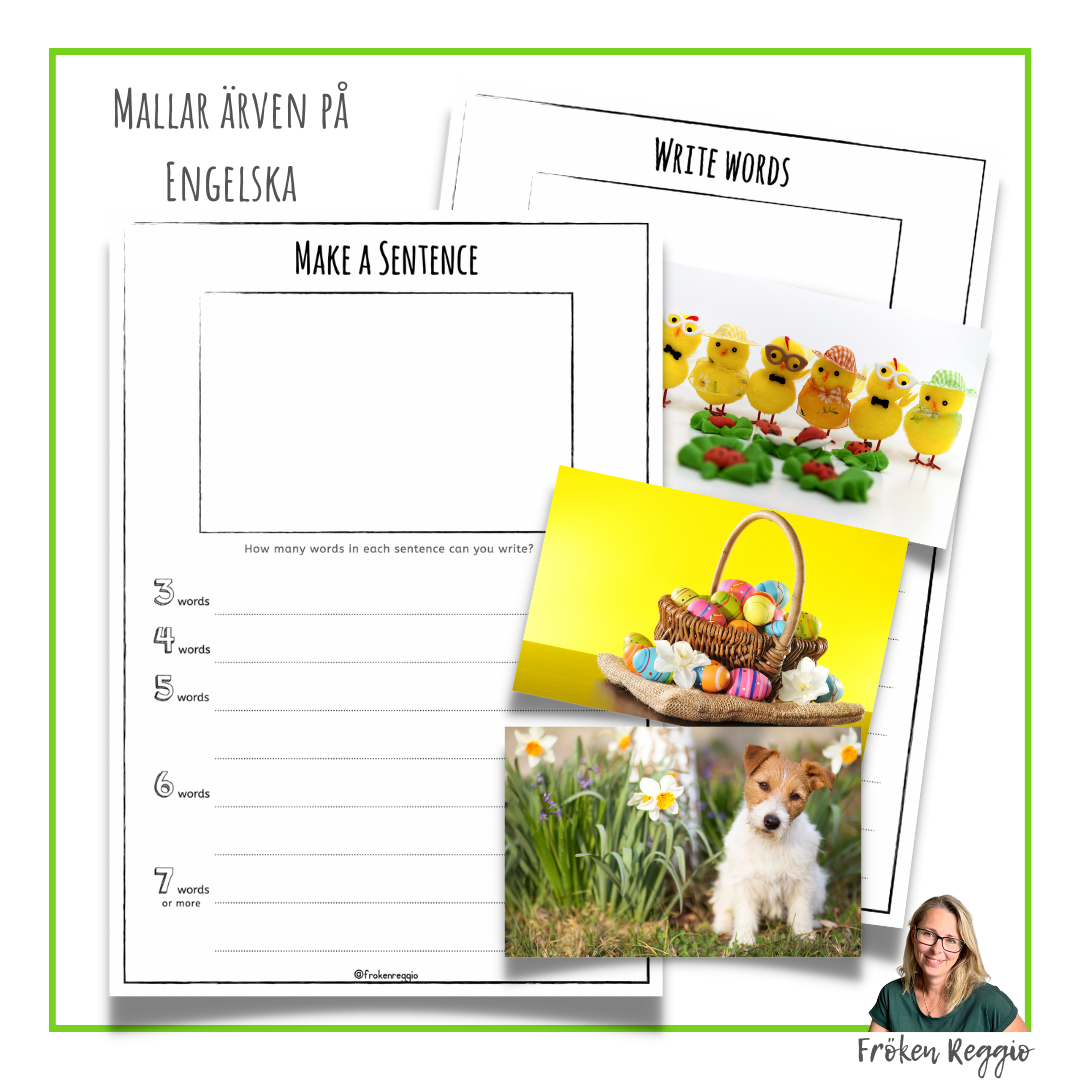 24 bilder och 2 mallar på både svenska och engelska. Välj en bild och klistra den i rutan. Skriv meningar till bilden.