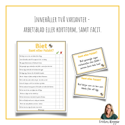 Ett material för att göra den kooperativa rutinen ”Sant eller falskt”. Innehåller 16 påståenden om biet baserade på texterna i mina material ”Biets Livscykler” och ”Biet – Naturens Hjältar”, Finns i två varianter – arbetsblad eller i kortform, samt facit.