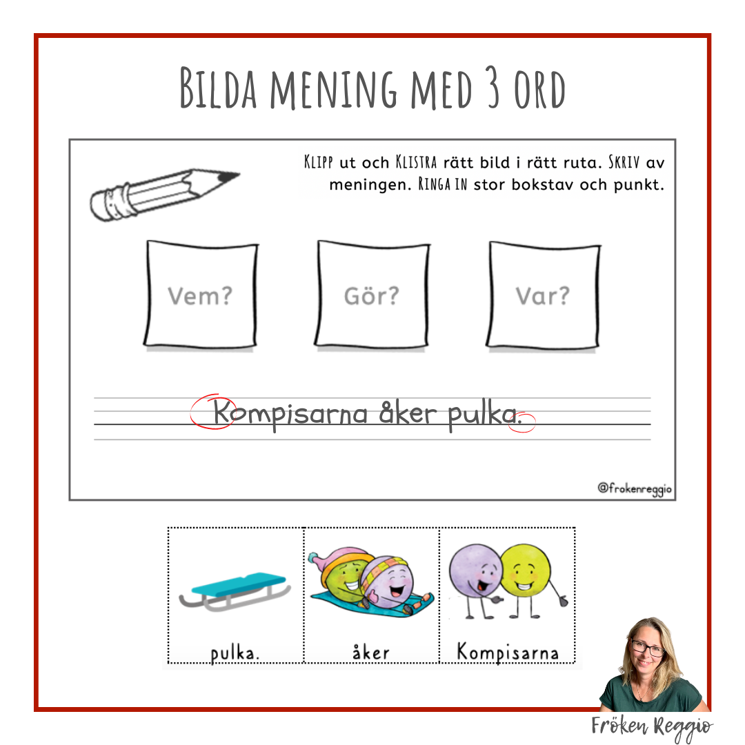 Klipp ut och klistra rätt bild i rätt ordning i rätt ruta. Skriv av meningen. Ringa in stor bokstav och punkt.