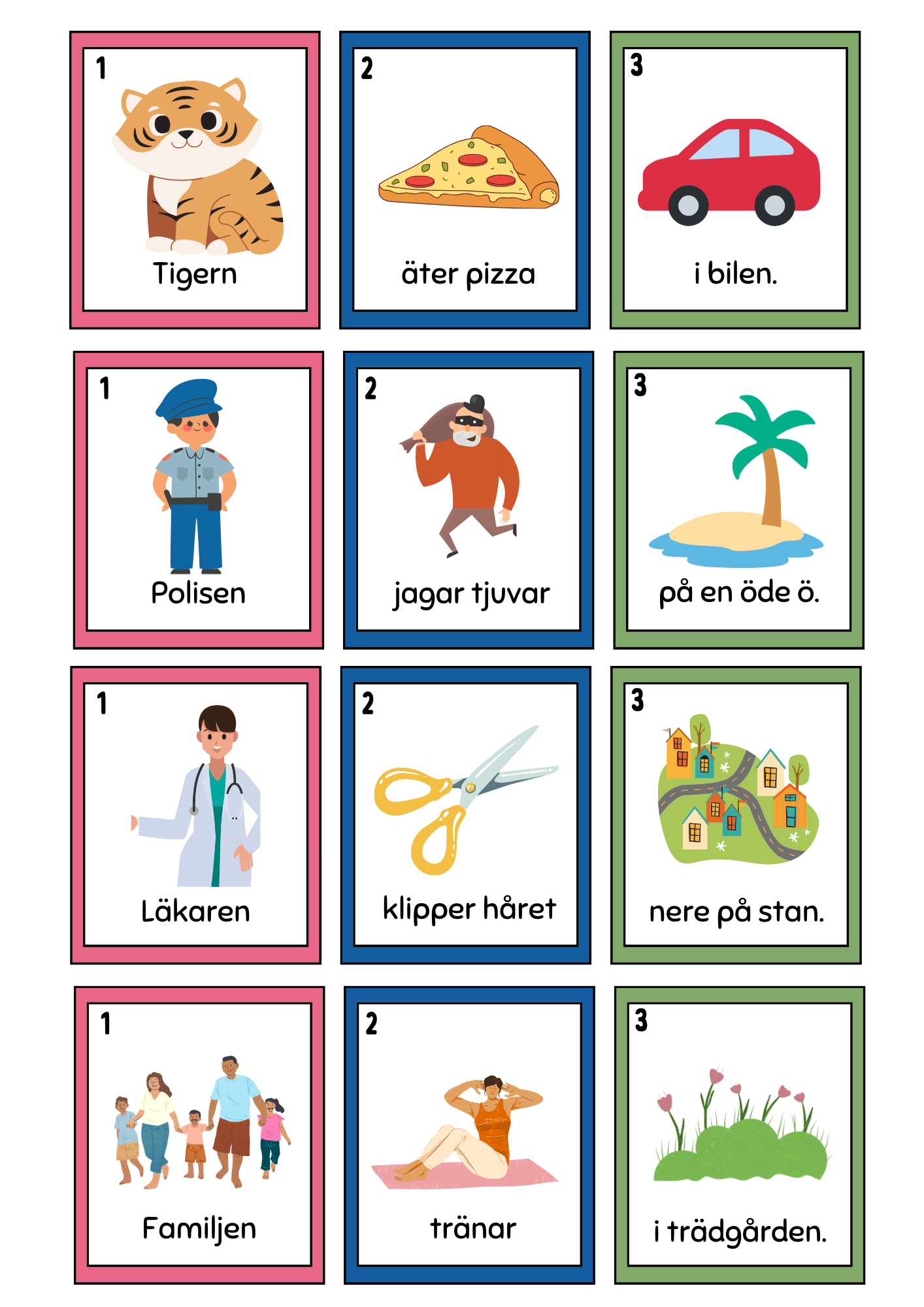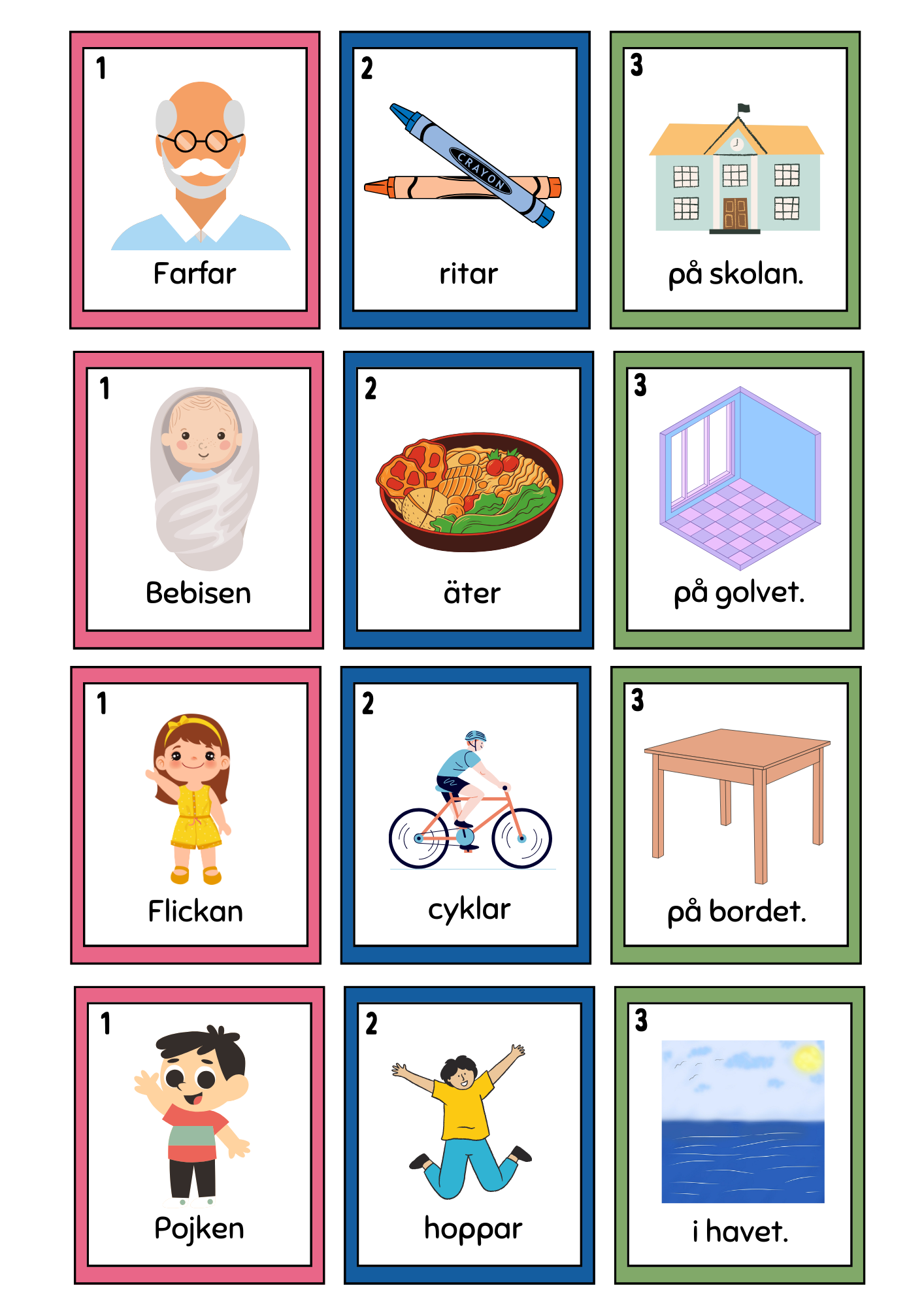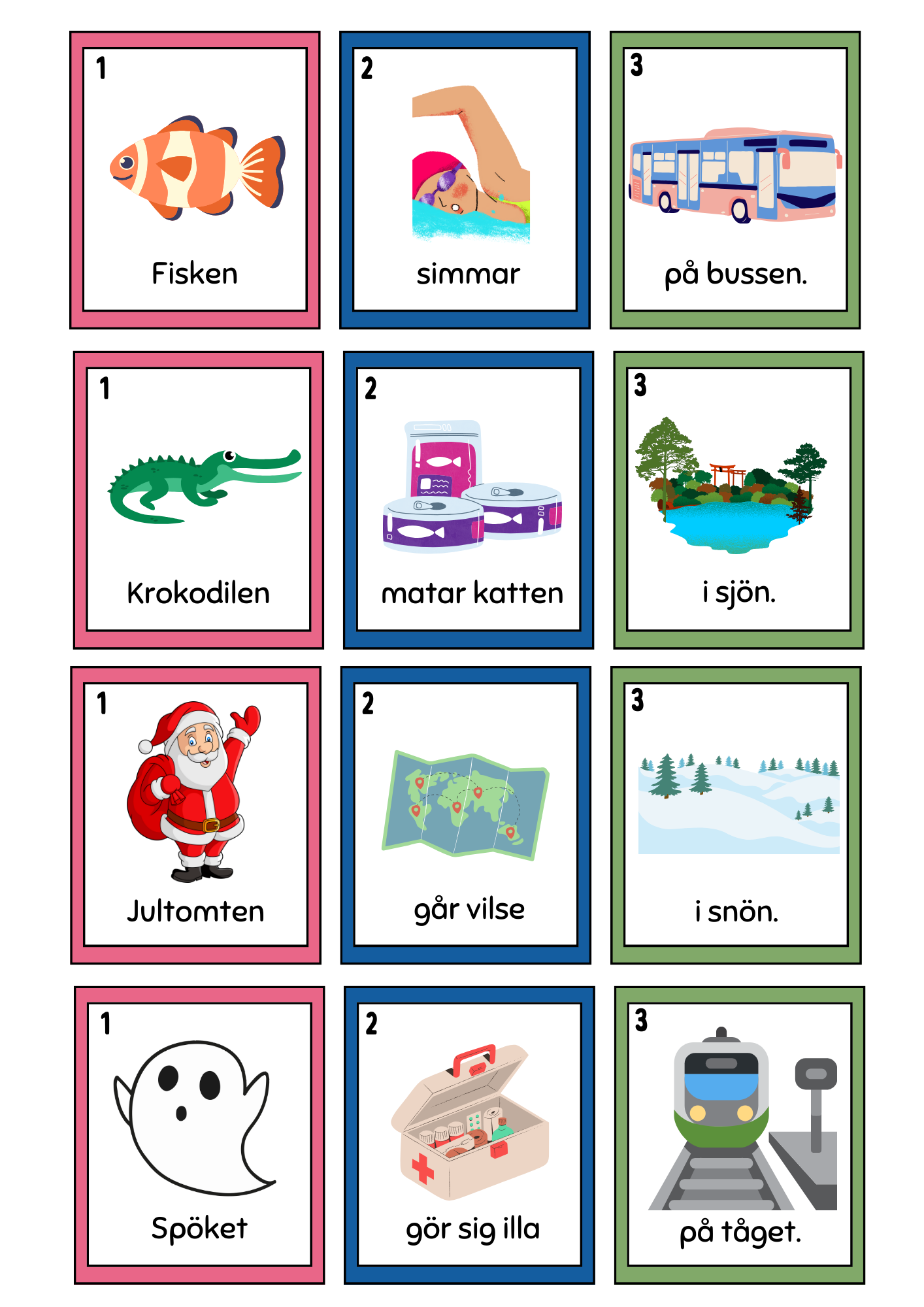 90 stycken kort att skriva ut, laminera och klippa ut. Eleverna drar ett kort från varje del och bildar en mening som de sedan kan läsa/skriva.