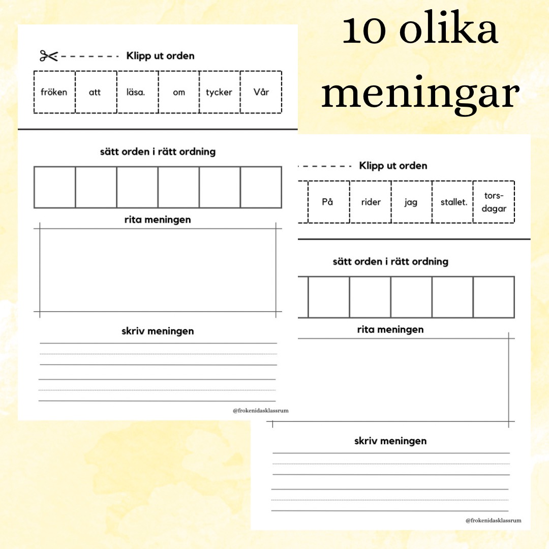 Arbetsblad där eleven klipper ut ord, sätter ihop dem till en mening, ritar meningen och skriver den.