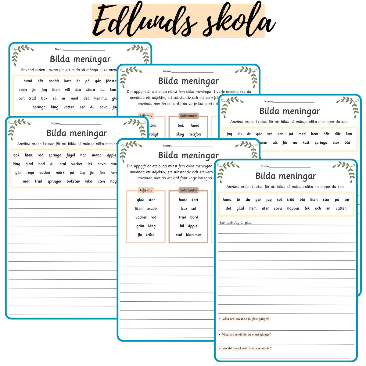 6 arbetsblad att öva på att bilda meningar utifrån vissa angivna ord.