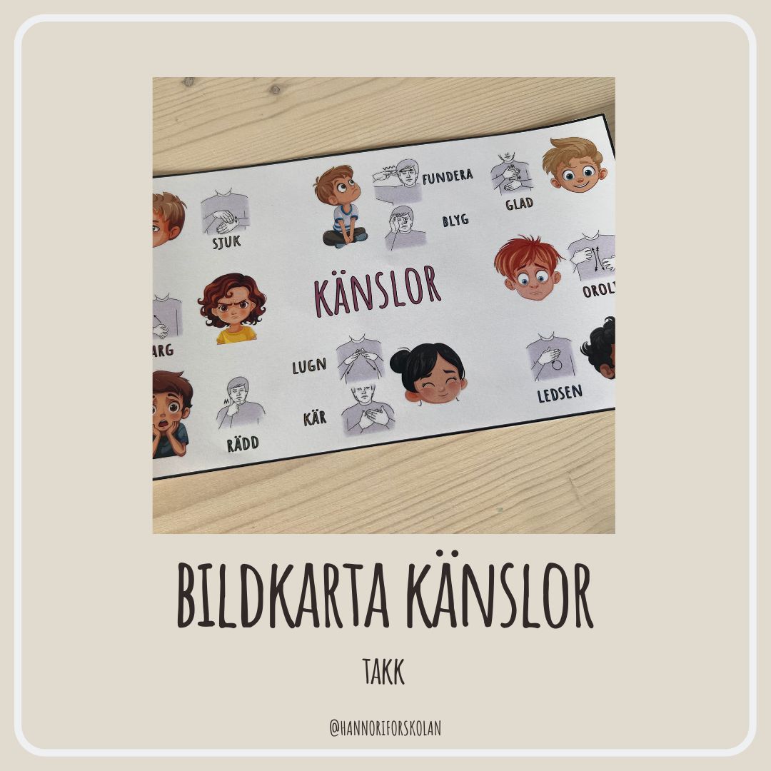 Bildkarta känslor – det här materialet ger barnen möjlighet att träna på TAKK-tecken. Hos oss finns materialet tillgängligt i vår miljö.