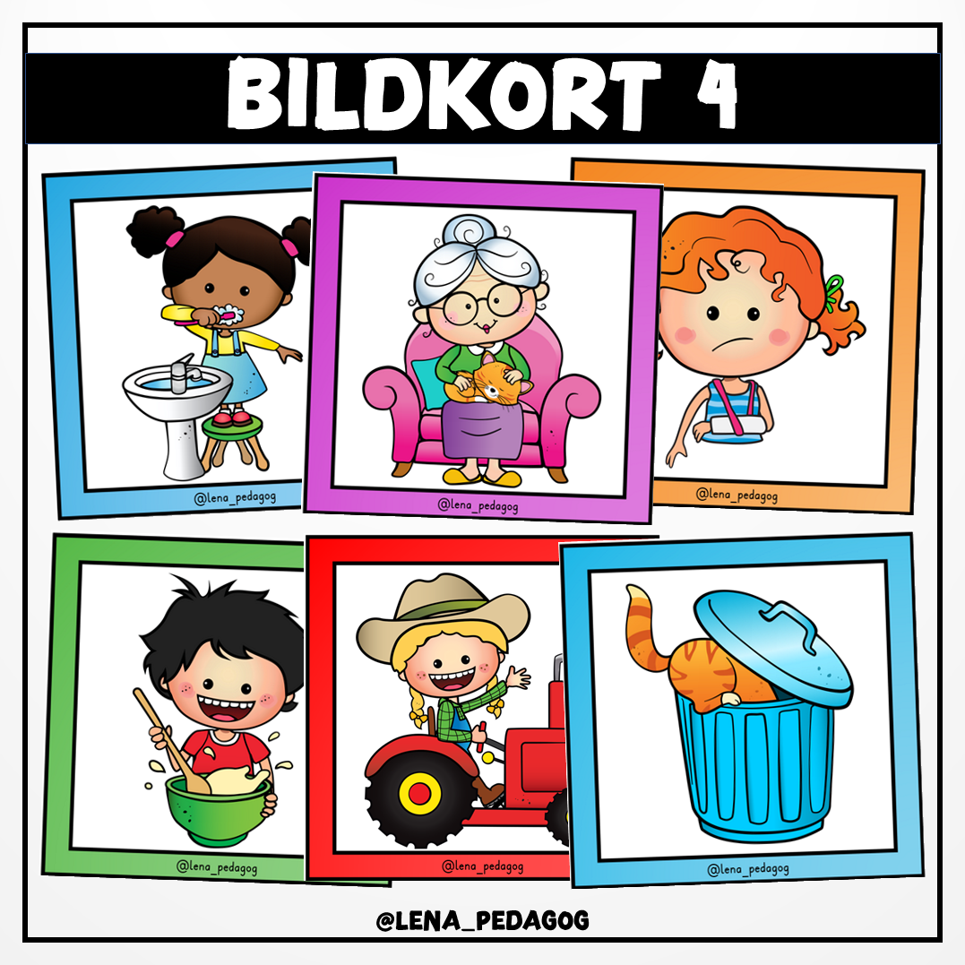180 kort med blandade motiv. Set 4 av 4. Kan användas för att skapa memoryspel, i SVA-utbildning, när eleverna ska bilda meningar/berättelser på svenska/engelska, träna meningsuppbyggnad m.m.