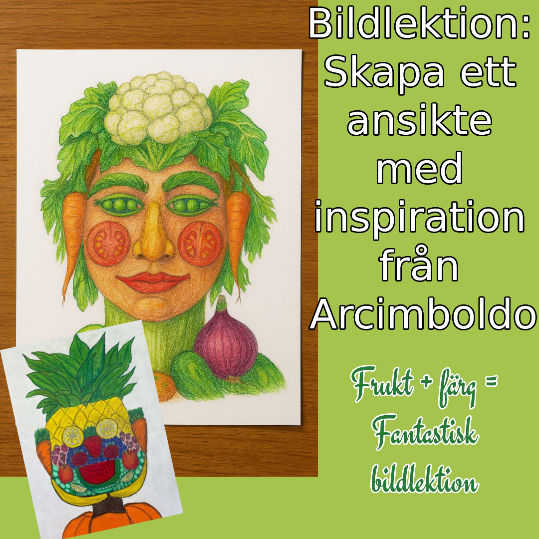 I denna färdiga bildlektion får dina elever utforska porträtt på ett nytt och oväntat sätt – genom att skapa ansikten med hjälp av frukt, grönsaker och andra naturliga föremål. Uppgiften är inspirerad av konstnären Giuseppe Arcimboldo, känd för sina surrealistiska porträtt byggda av allt från fiskar till böcker.