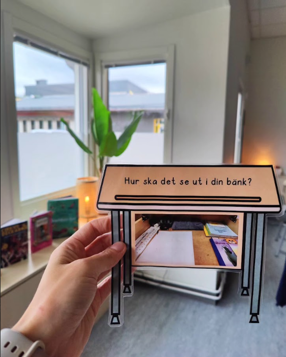 Bildstöd för att visa hur det ser ut när det är ordning och reda i bänken. Ta kort i en bänk som du vill använda som målbild. Skriv ut och klistra på mallen. Om en elev behöver städa sin bänk, låna ut bildstödet så kan eleven tydligt se hur det ska se ut, samtidigt som de tycker att det är lite roligt!