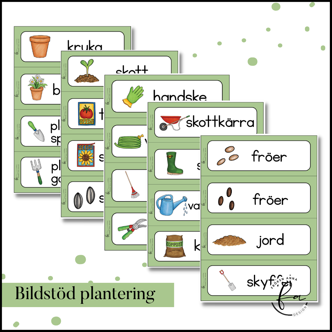 Bildstöd med ord och begrepp vid plantering och trädgård. Använd för att utveckla ordförrådet inom detta område och gärna tillsammans med materialet ”Jag planterar” om du planterar tillsammans med barn.