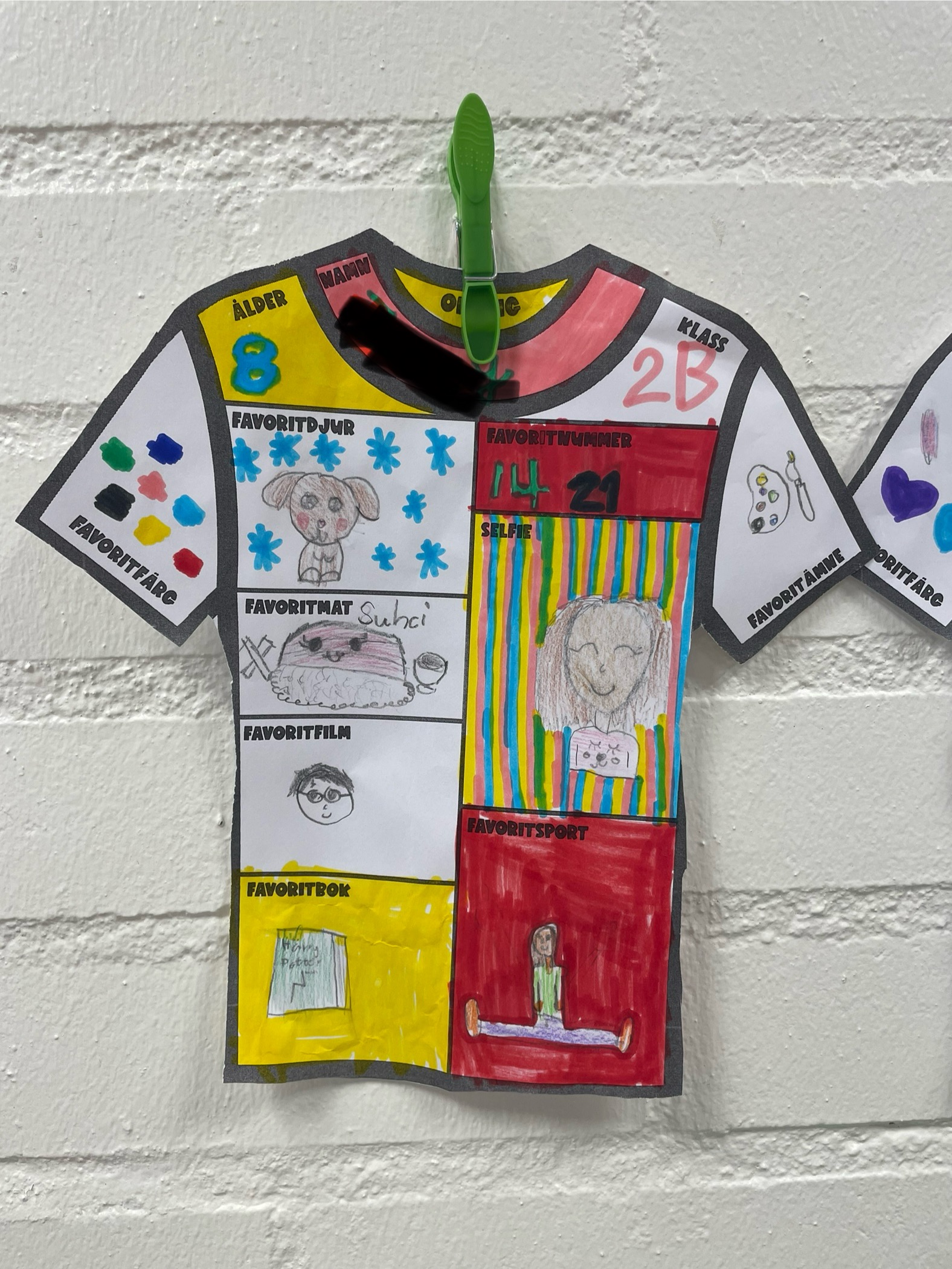 Bilduppgift- t-shirt om sig själv. Låt eleverna fylla i fakta om sig själv och måla mönster/färglägga sin egen t-shirt.