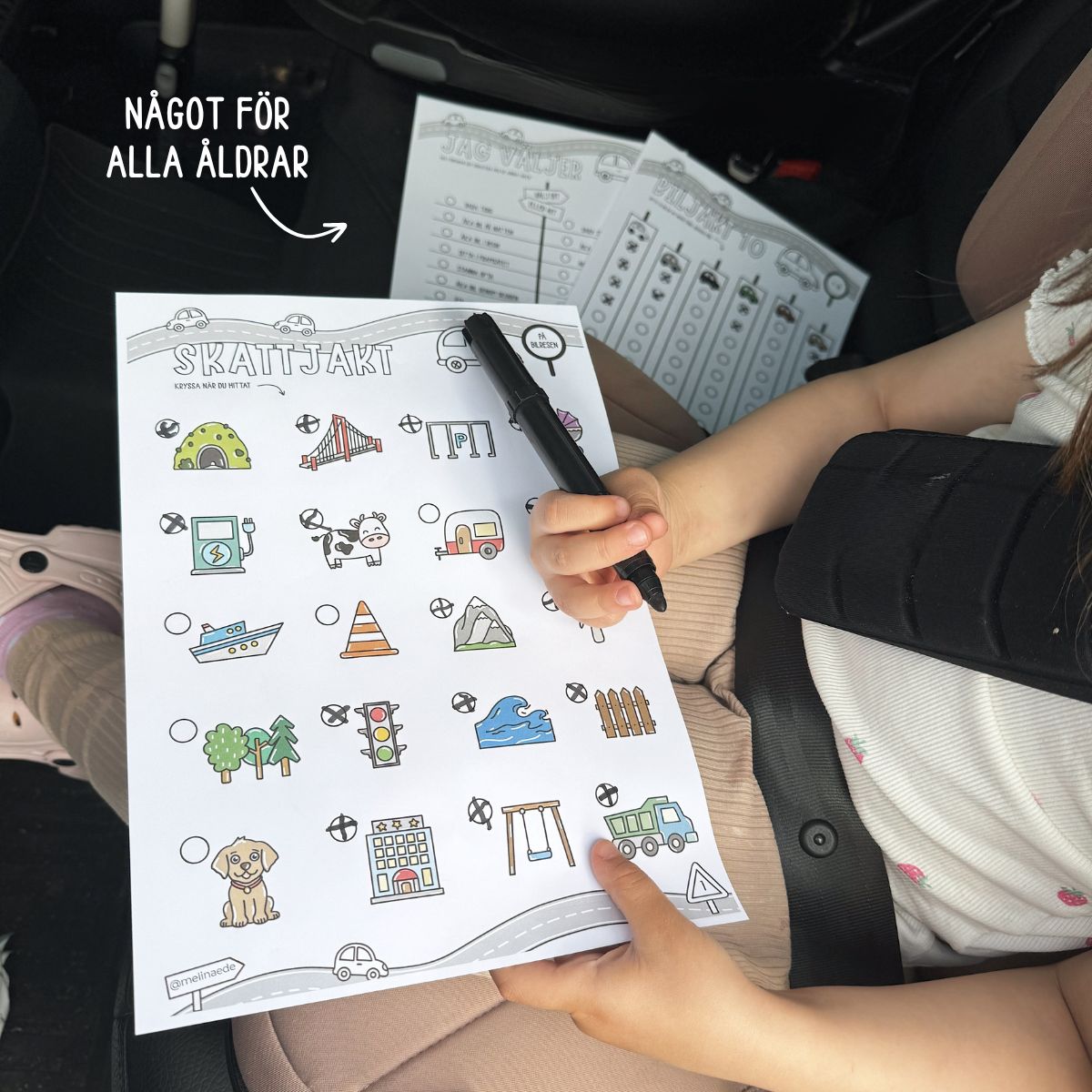 Allt är anpassat för bilresan, inga saxar eller kladdiga material behövs. Häftet passar barn, elever och pedagoger i alla åldrar. Skriv bara ut sidorna och packa ner några pennor.