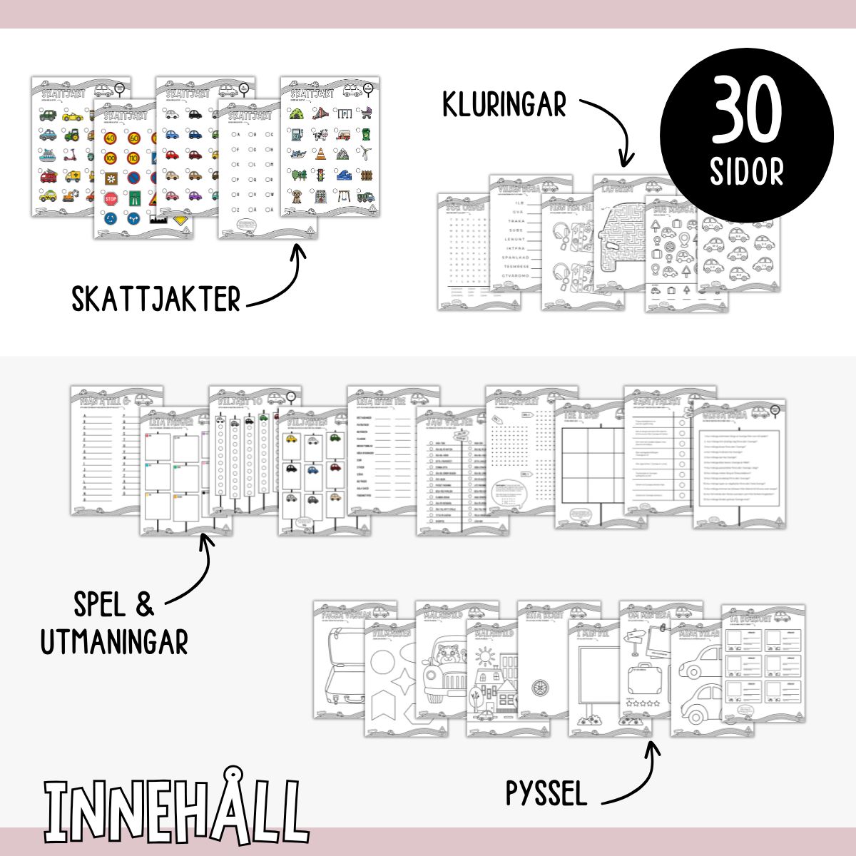 30 sidor med utmaningar, skattjakter, spel, pyssel och kluringar för bilfärden.