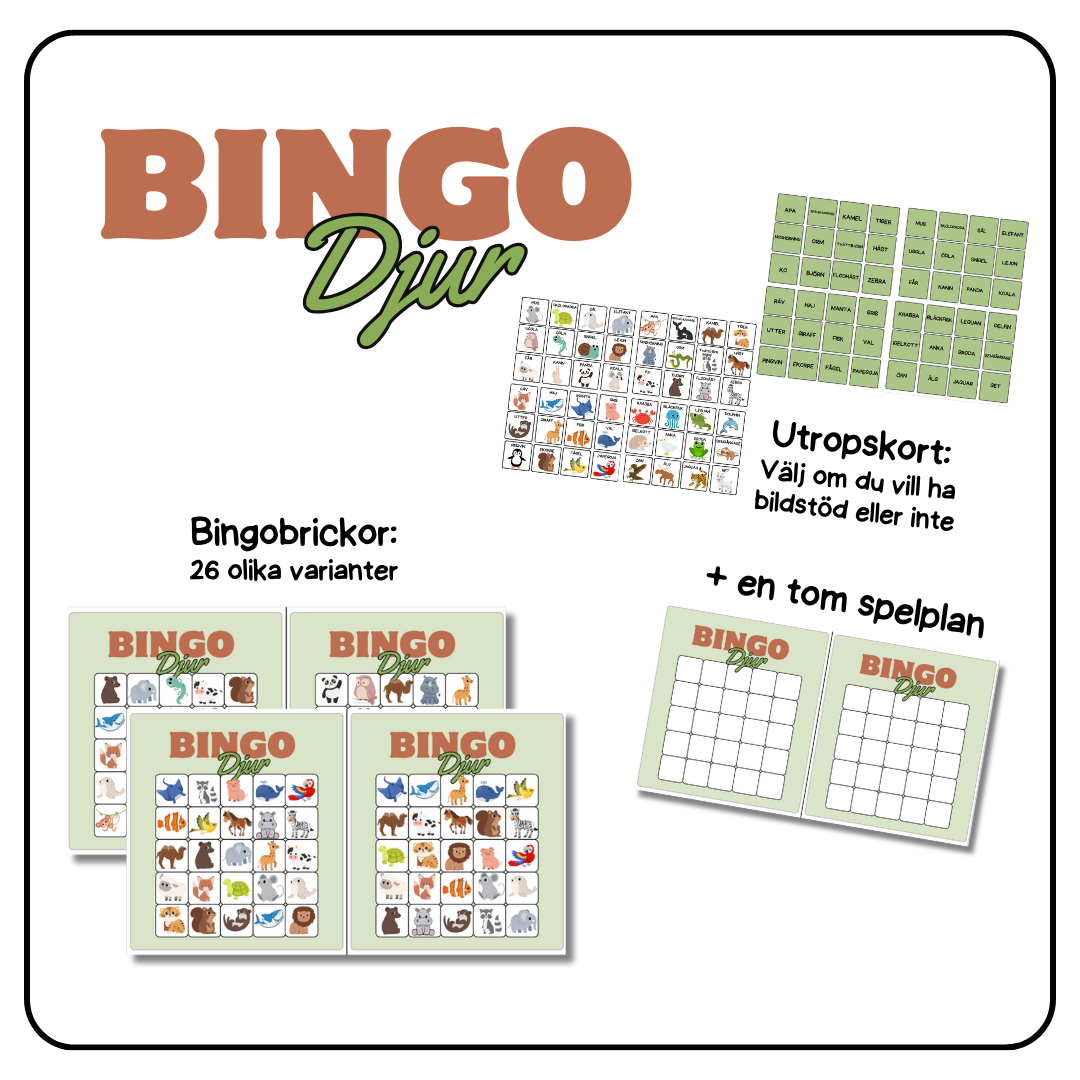 Jag har skapat ett bingo med djur. Det är totalt 26 olika varianter av bingobrickor och 48 olika djur och utropskort. Det kommer även med en tom spelplan om man vill att eleverna skriver egna djur för att träna sin stavning.