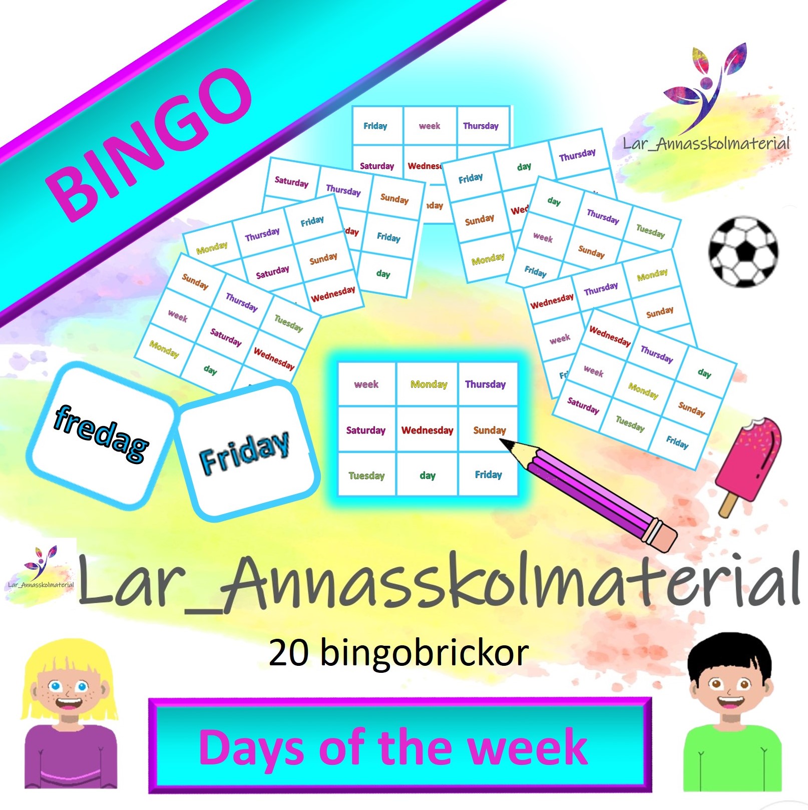 Ett bingo där eleverna tränar på engelska veckodagarna. Ingår i samma serie som Engelska Days of the week.